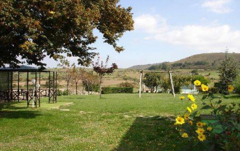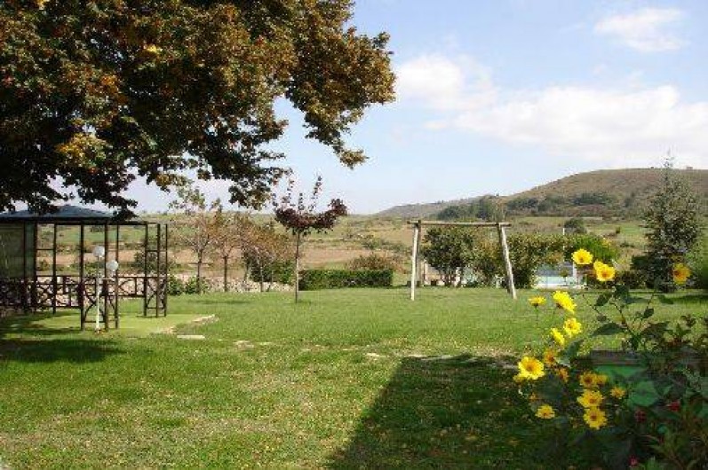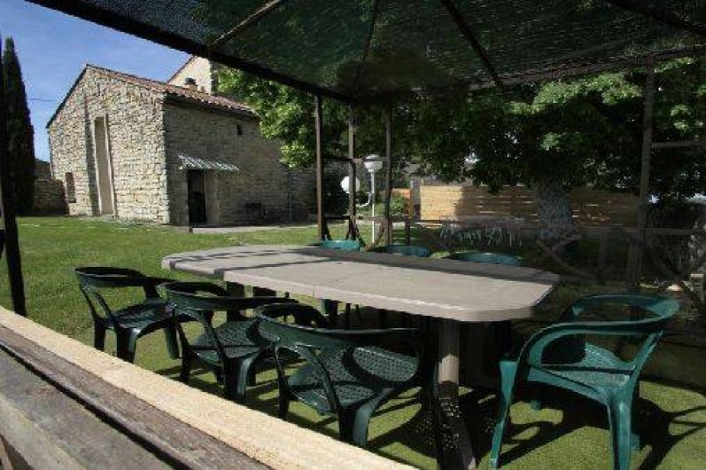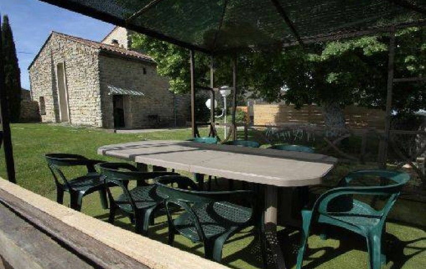 Vous pourrez profiter de la pergola extérieure avec salon de jardin sur le terrain arboré.