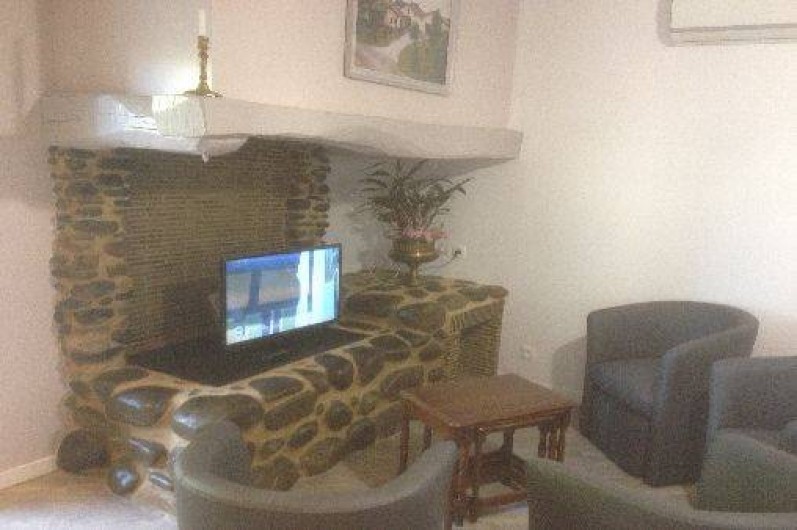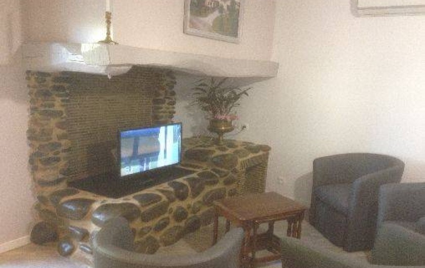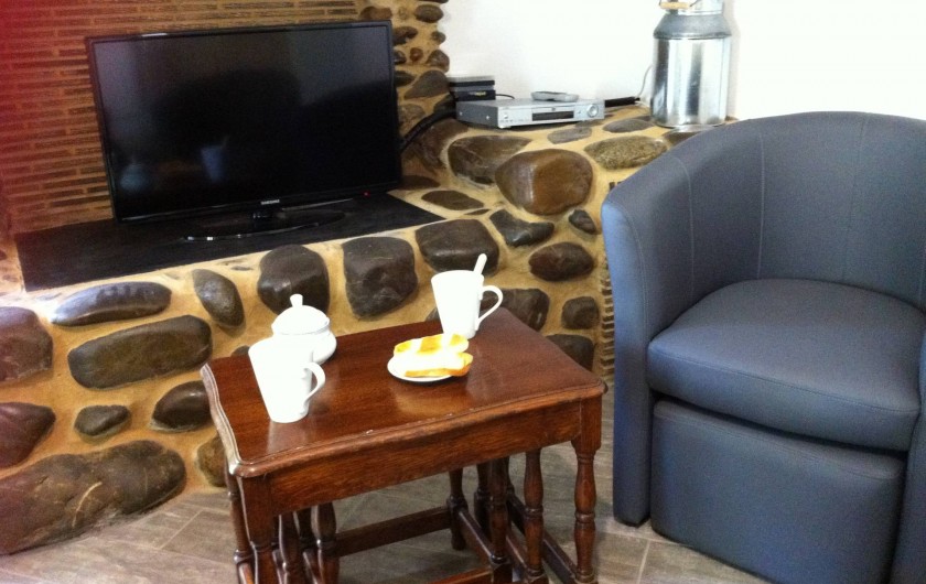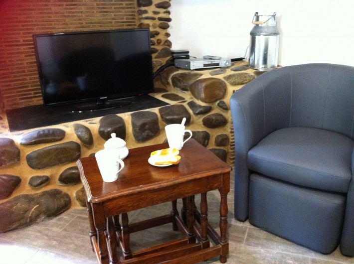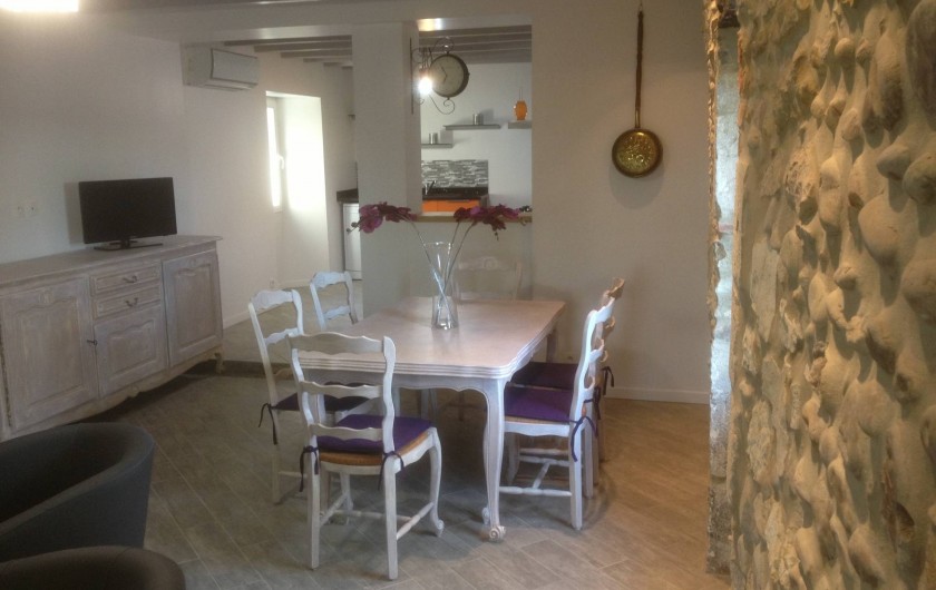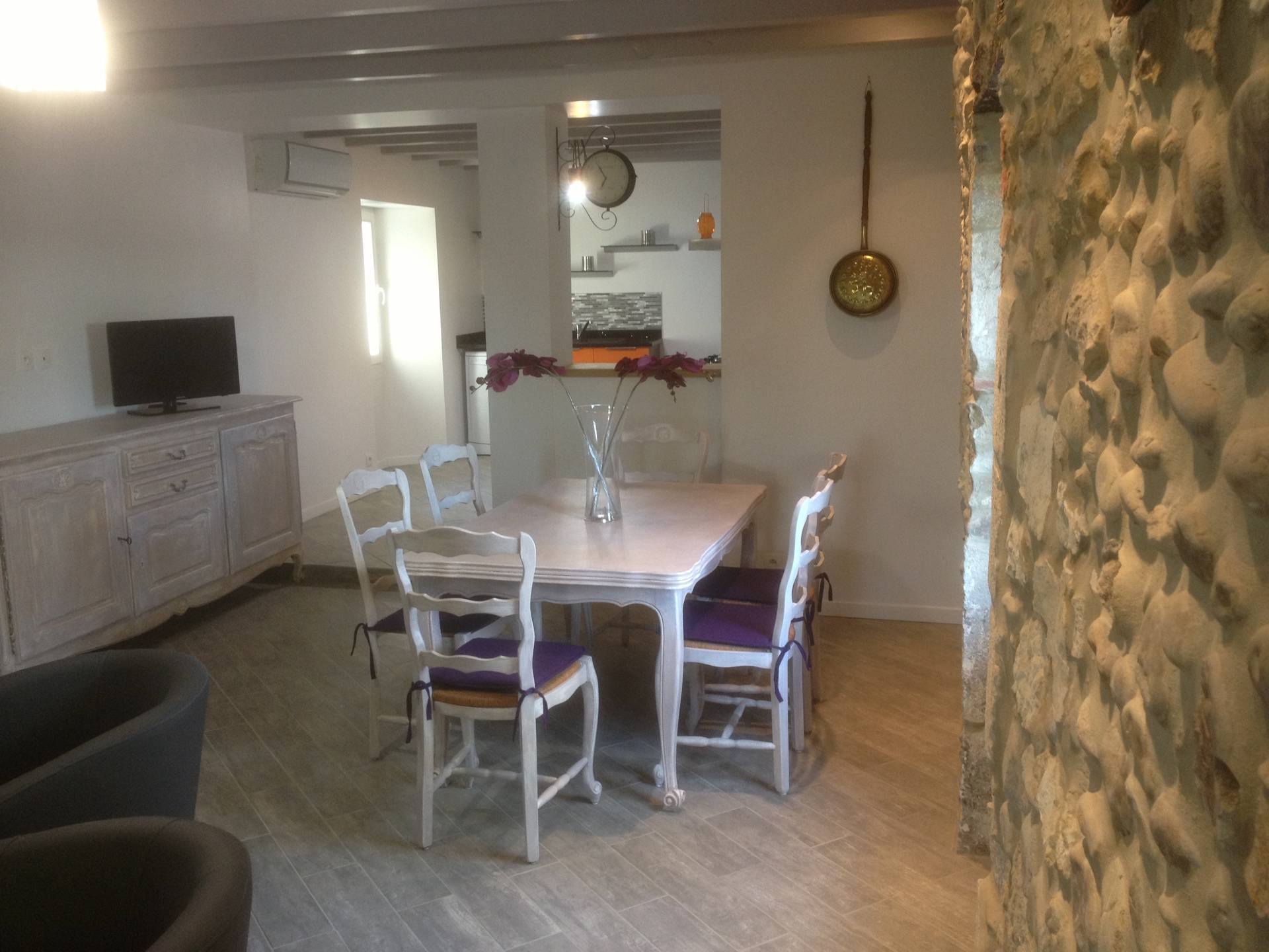 La salle à manger et le coin salon ont préservé leur côté typique avec poutres apparentes et mur de pierres et galets du Gave, tandis que