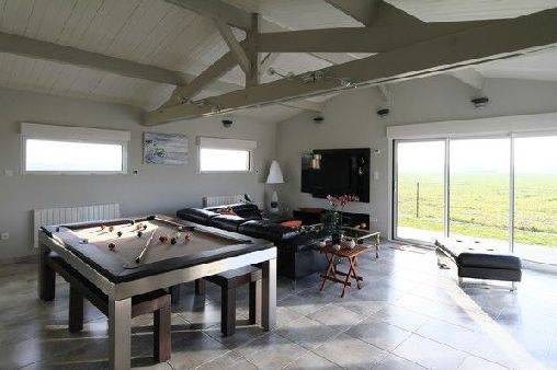 Grande terrasse bien exposée, jardin clos (transats, vélos à disposition, jeux d’extérieur). Rez-de-chaussée : grand séjour, salon avec TV écran plat, billard, baby-foot, canapé cuir, cuisine ouverte toute équipée (lave-vaisselle, micro-ondes, four), 1 chambre 2 personnes (1 lit 160X200cm) avec salle d'eau et WC privatif, 1 chambre 2 personnes (1 lit 160x200cm), salle de bains, WC séparé, buanderie, 1 mezzanine 2 personnes (2 lits 90x190cm) ouverte sur le rez-de-chaussée. DRAPS FOURNIS ET LITS FAITS à l’arrivée, produits d’entretien de 1ère nécessité à disposition. Wifi gratuit. Forfait ménage possible.