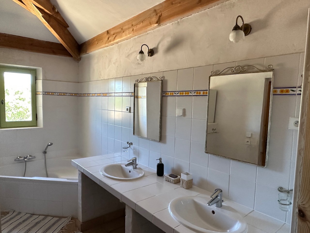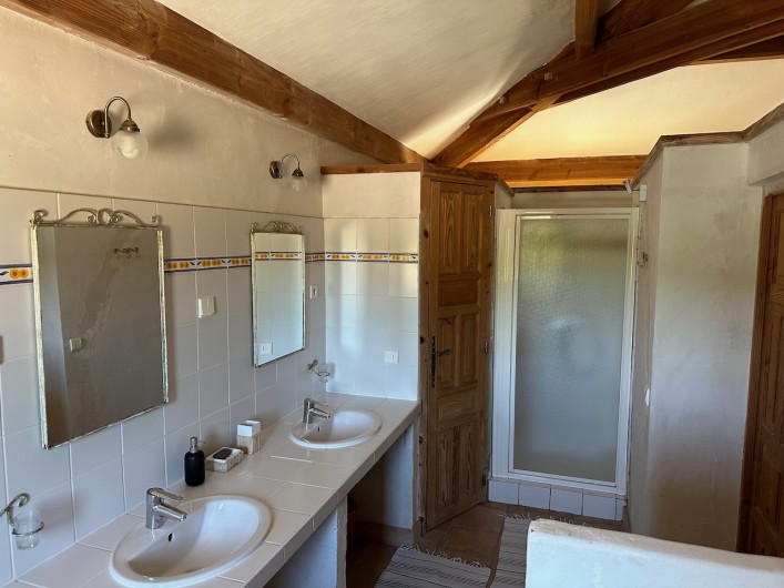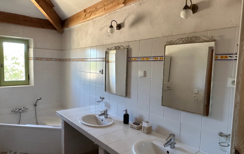 1) Grande chambre à l’étage de 30 m2 (1 lit 180 x 200 séparables, 2 lits simples 90 x 200) avec grande salle de bain attenante : baignoire d’angle, douche, 2 vasques et WC séparé ;