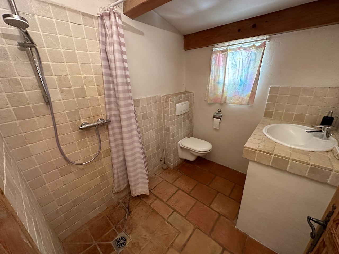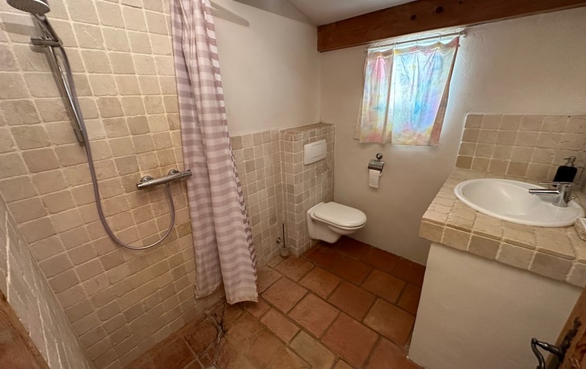 2) Chambre au rez-de-chaussée de 16 m2 (1 lit 160 x 200) avec salle d’eau attenante : douche, vasque et WC.