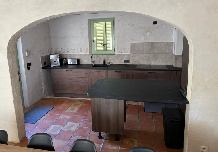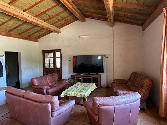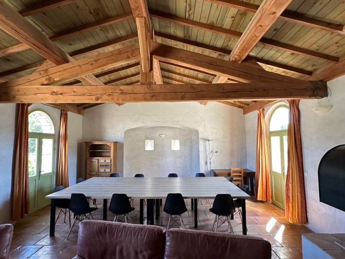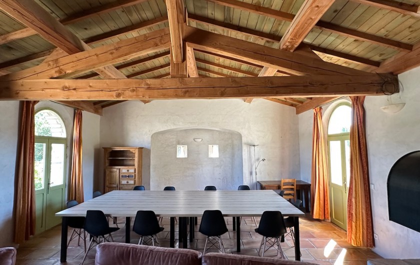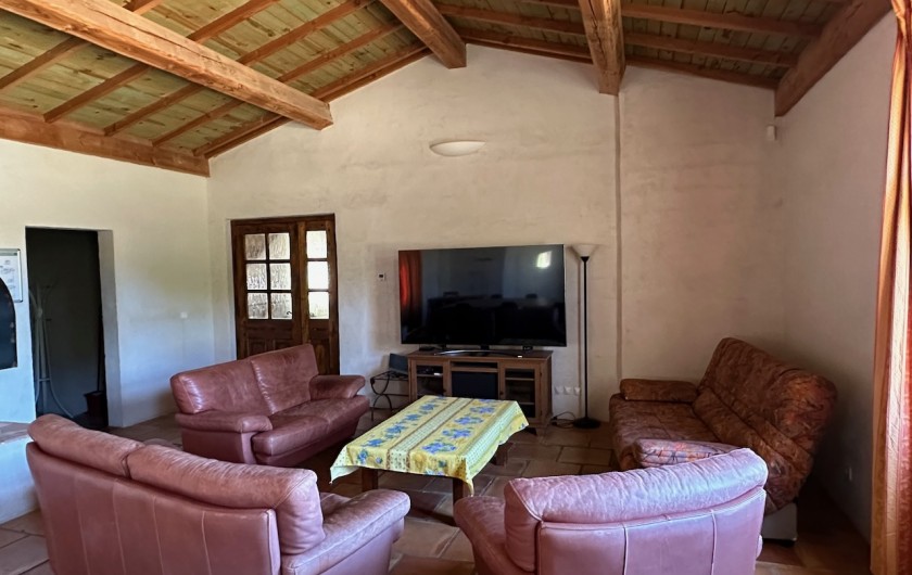- Grand salon et séjour de 60 m2 pouvant être utilisé en salle de réunion. Box reliée à la fibre, wifi et très grand écran TV de 189 cm de diagonal. Possibilités de livraison de repas.