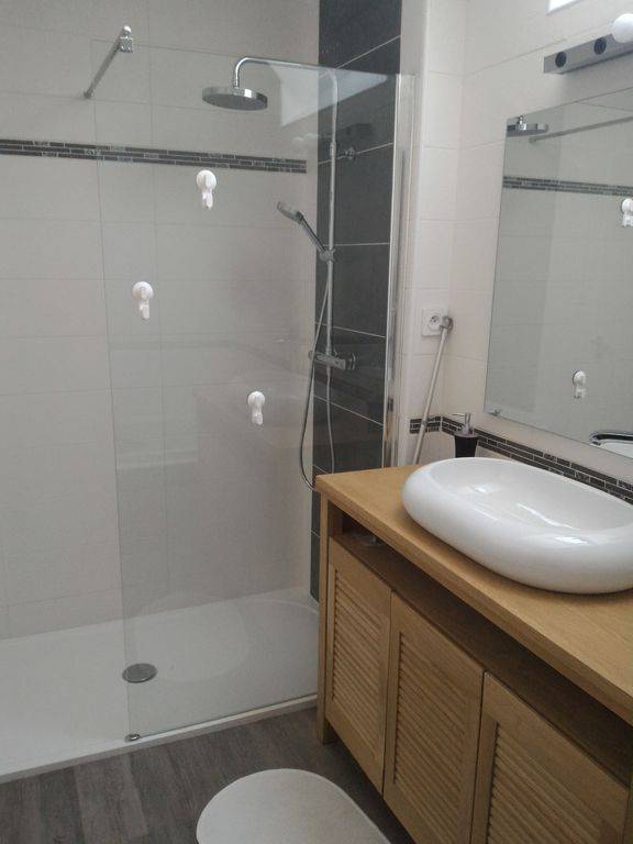 Vous trouverez au rez de chaussée un séjour salon de 30 m2, une cuisine entièrement équipée. Un coin buanderie avec lave linge et sèche linge, un wc et une chambre avec un lit double et une salle d'eau privative.