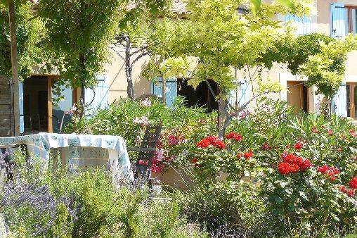 Votre gîte s’ouvre sur une grande terrasse fleurie privative avec mobilier de jardin