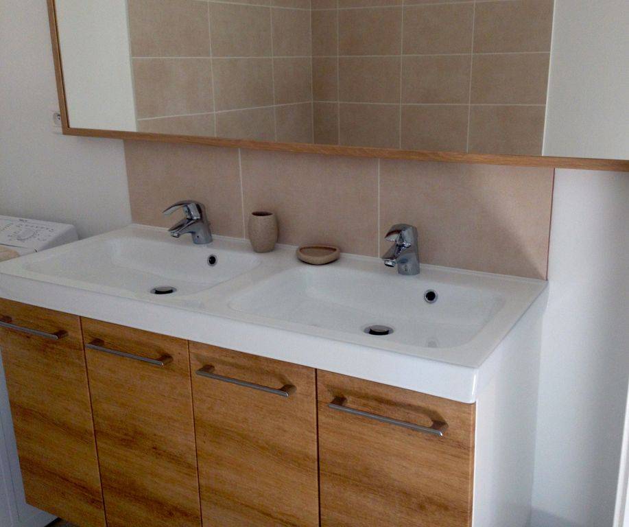 double et d'une douche à l'italienne, et des toilettes, indépendante. La pièce à vivre qui comprend le salon, le coin repas et la cuisine ouverte est très grande (45 m²) et très lumineuse.