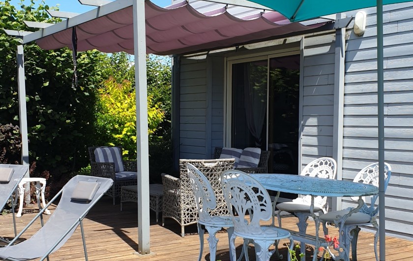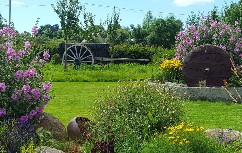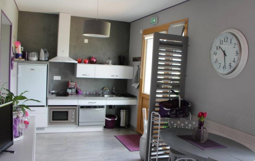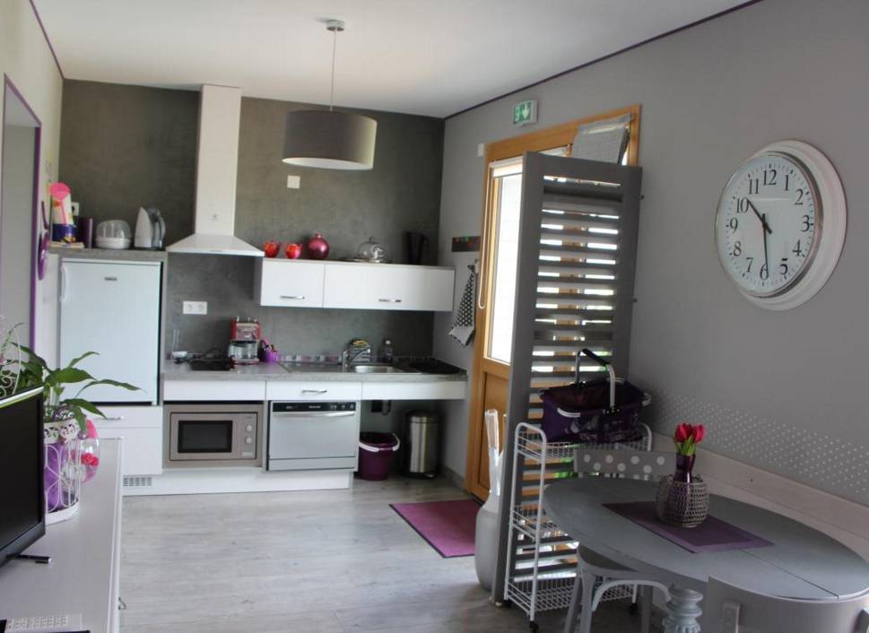petite cuisine intégrée, espace salon (canapé, fauteuil), 1 chambre (lit 160x200, lit bébé), salle d'eau avec wc. Terrasse, parking, grand jardin. LL. SL. TV. Accès internet. Draps et linge de toilette inclus, lit fait. Agrément Tourisme et Handicap.