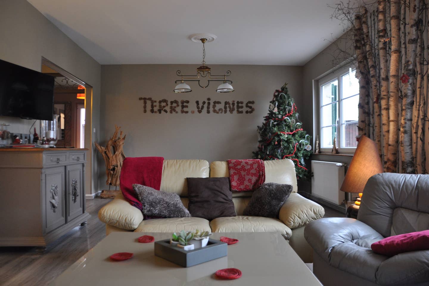 entièrement équipé , salle de bain, très grand salon et coin jeux, Très grande terrasse salon de jardin transat barbecue et plein sud vue sur le vignoble. En bas jardin pour les enfants balançoire ,trampoline, tennis de table, baby foot, sur demande vélos.