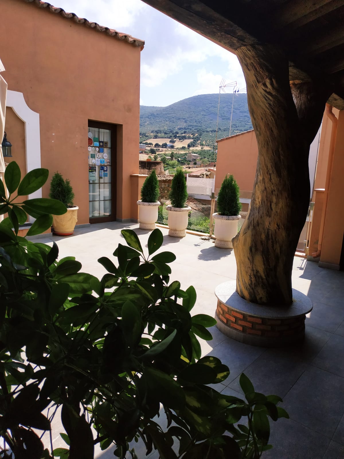 La terraza-solárium con vistas a la sierra de Siruela, permite la relajación a cualquier hora del día, al sol o a la sombra, en la galería de construcción recuperada con vigas y cabrios.