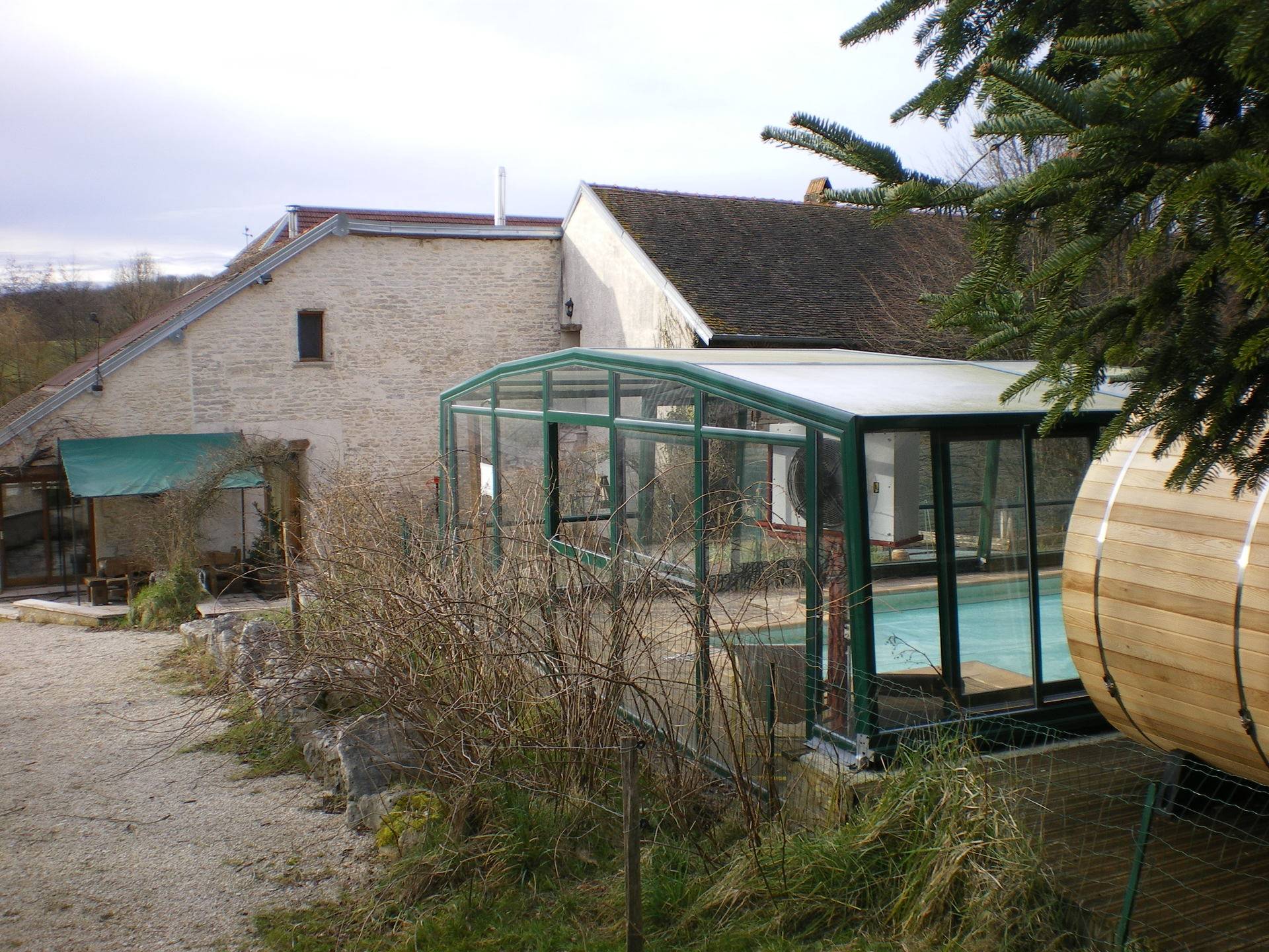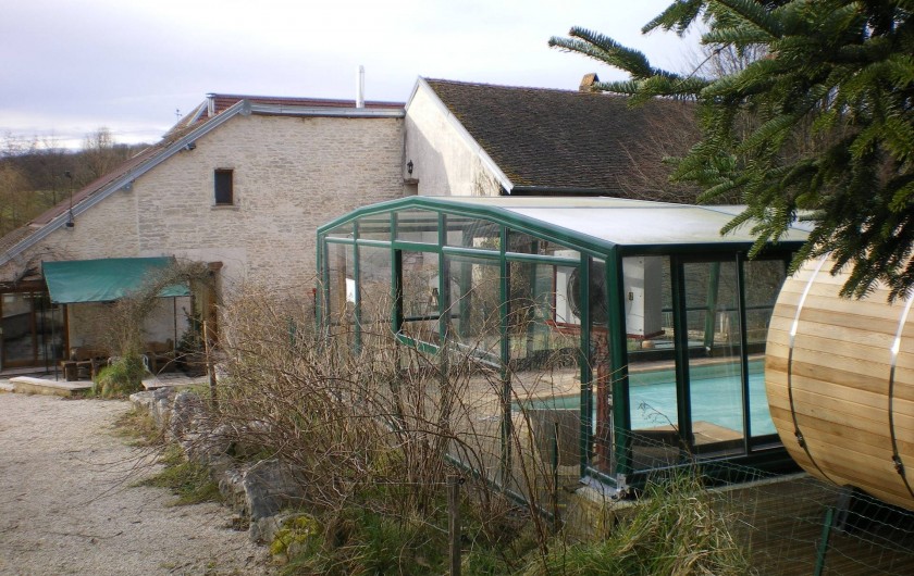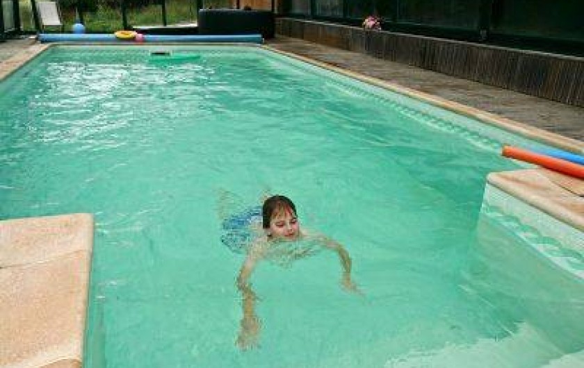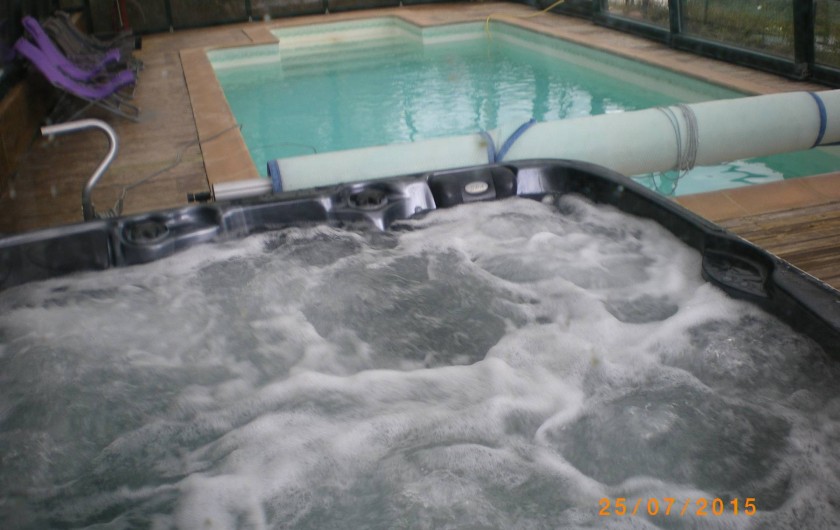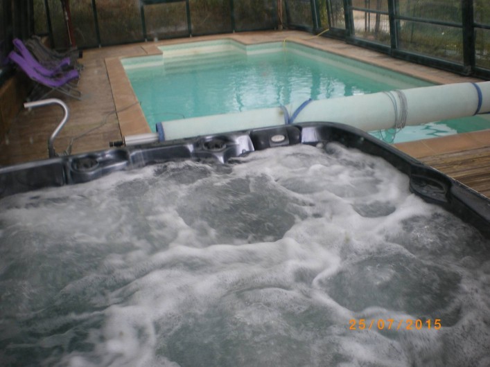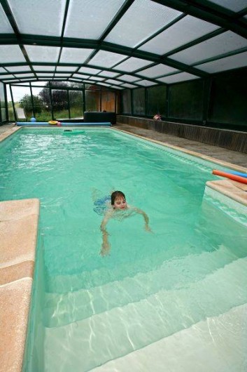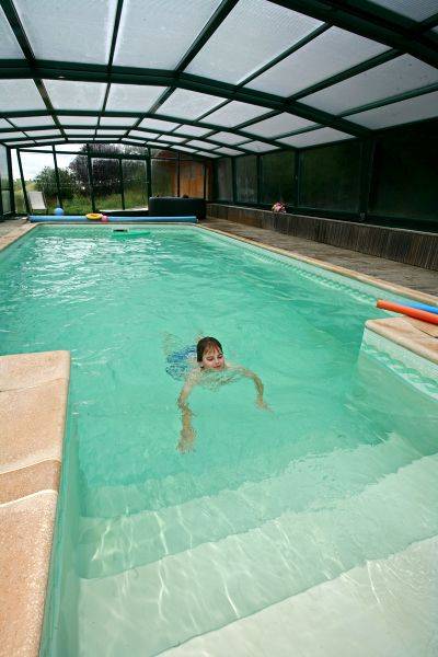 Piscine couverte au sel , chauffée à 34 degrés toute l'année grâce au bio-gaz de la ferme + SPA + Sauna sur l'estrade de cette psicine.