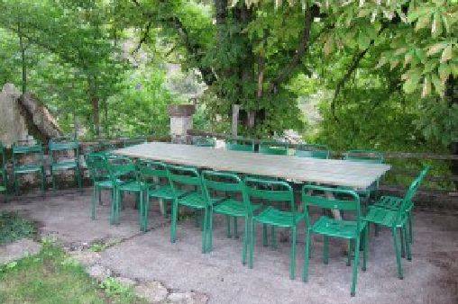 La salle commune donne directement sur la terrasse. Elle comporte trois tables et une trentaine de chaises.