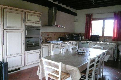 - Cuisine aménagée comprenant deux fours, un micro-onde, des plaques de cuisson à 4 brûleurs, un réfrigérateur avec compartiment congelateur, un lave vaisselle, un grille pain, une cafetière, une grande table et ses ??? chaises.
