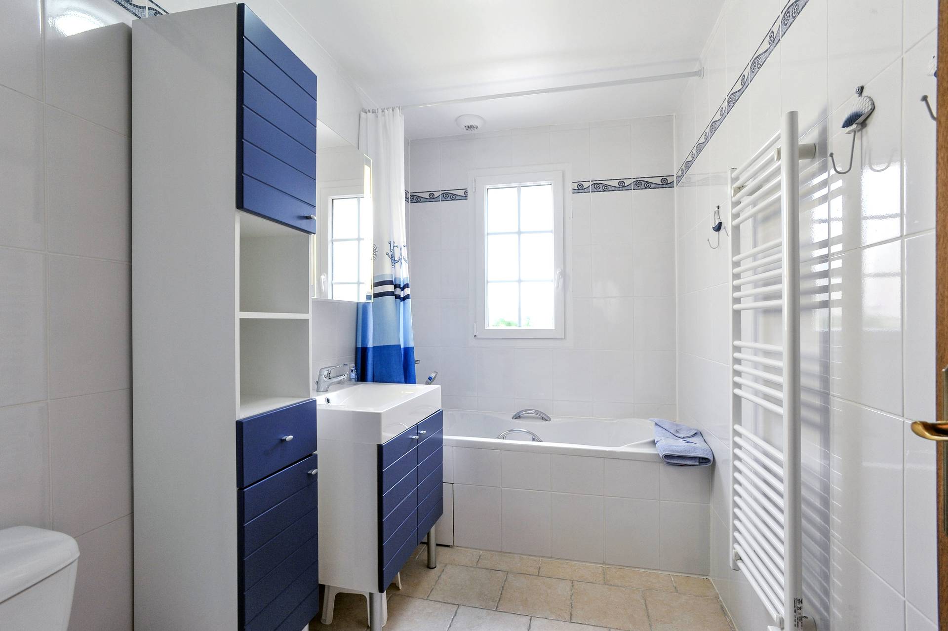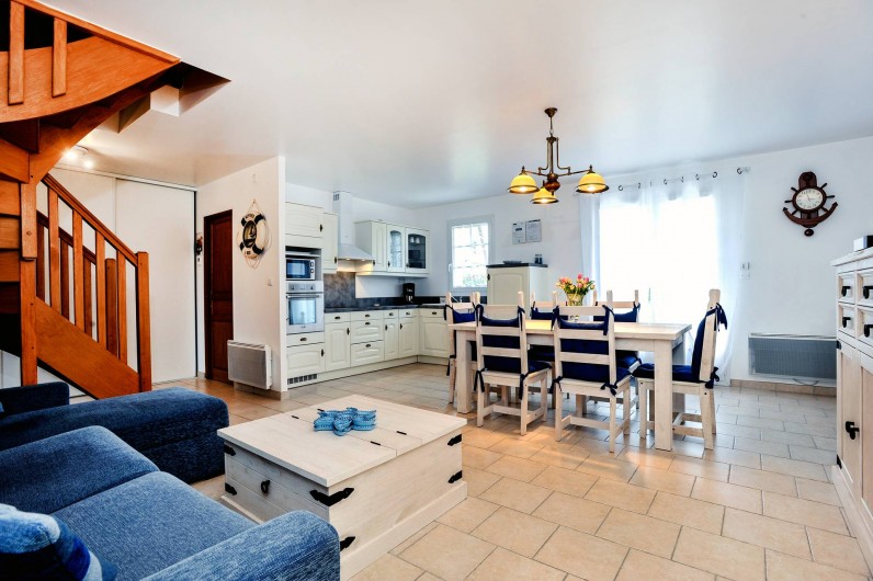 En rez de chaussée, grande pièce à vivre lumineuse et confortable avec cuisine aménagée et équipée, salle de bains et wc.