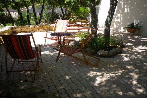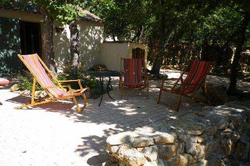 Jolie terrasse ,orientée plein sud, devant le gîte avec table de pique nique et transat pour des moments de détente au soleil.