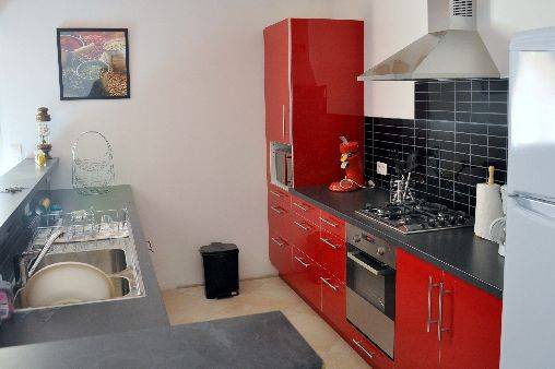 RDC : entrée dans une grande pièce de vie avec cuisine intégrée et espace repas, salon, buanderie, 1 chambre accessible pour personne à mobilité réduite (1x140) ouvrant sur la terrasse, wc indép., salle d'eau (douche à l'italienne