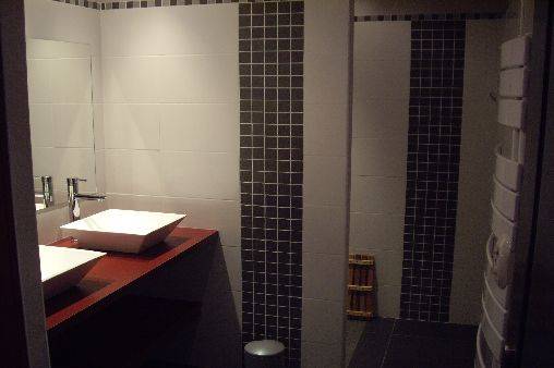 La salle de bain est équipée d'une douche à l'italienne, sèche cheveux et lave linge intégré dans un placard. WC indépendants. Climatisation et chauffage électrique