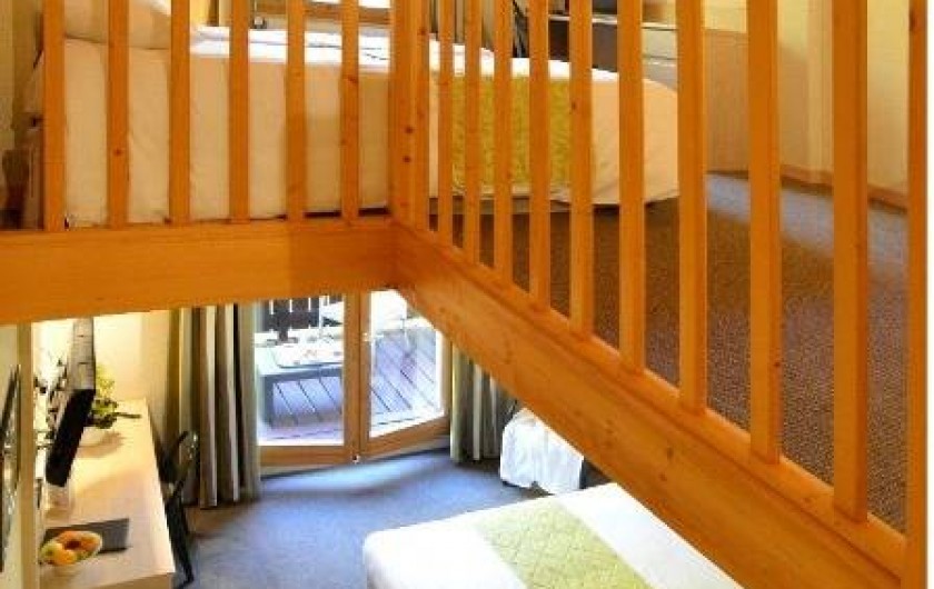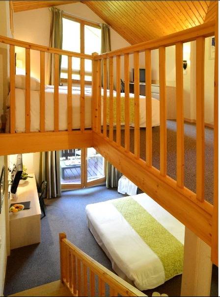 Les chambres familiales sont en mezzanine avec un balcon ; une salle de bain et une télévision par étage.