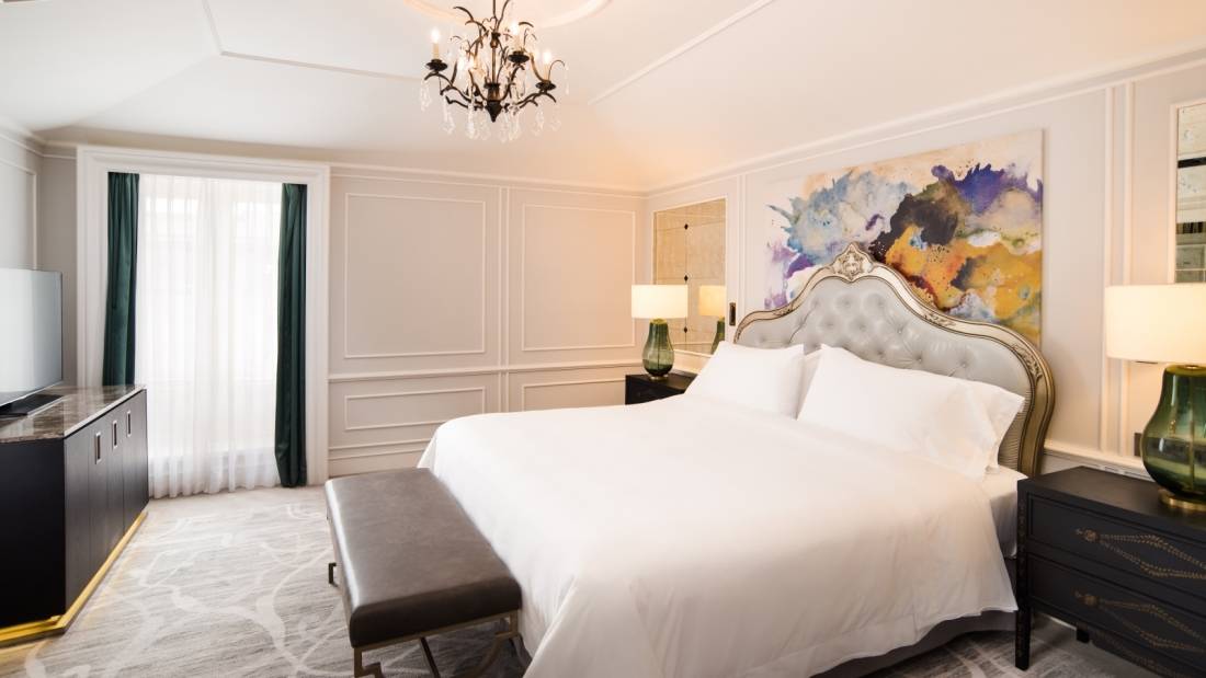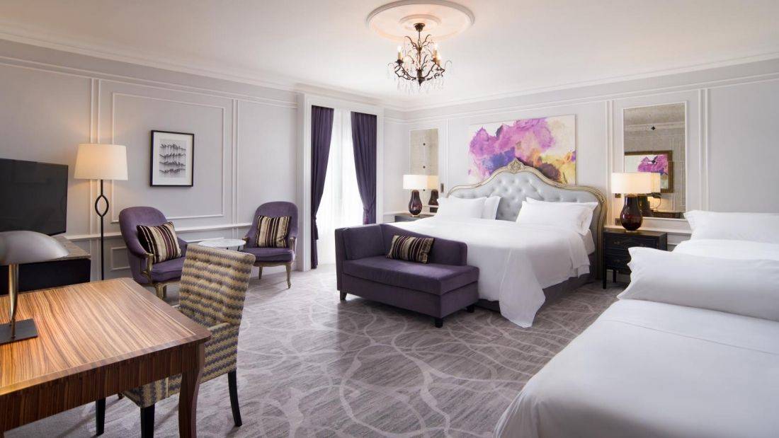 Chambres idéales pour le voyageur moderne, décorées dans d’élégants tons gris et beige aux détails couleur aubergine. Vous avez le choix entre des chambres avec vue sur le jardin Queen Garden et Classic : avec lit single ou queen. Les lampes en verre rond situées près du lit émettent une lumière tamisée qui tranche avec le style opulent du lustre araignée en verre.