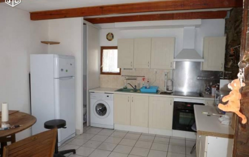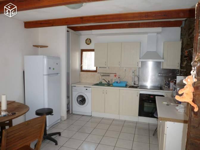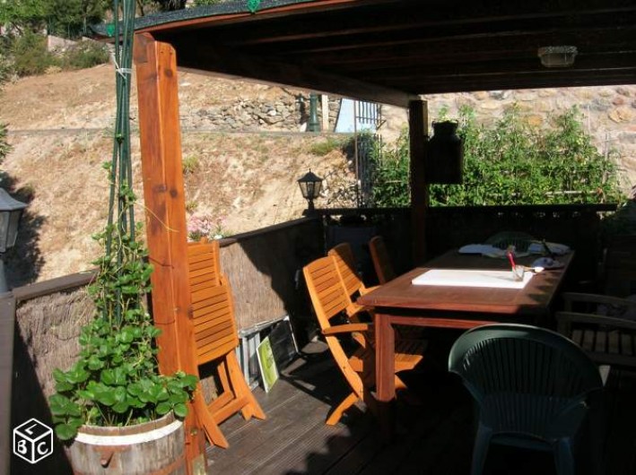 Petite maison en contre bas de la route où se trouve une grande terrasse, une cuisine ,un toilette ,une chambre avec douche.