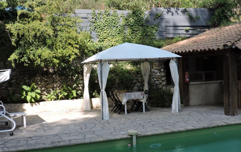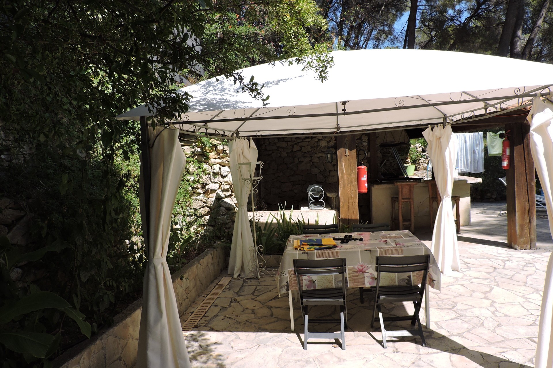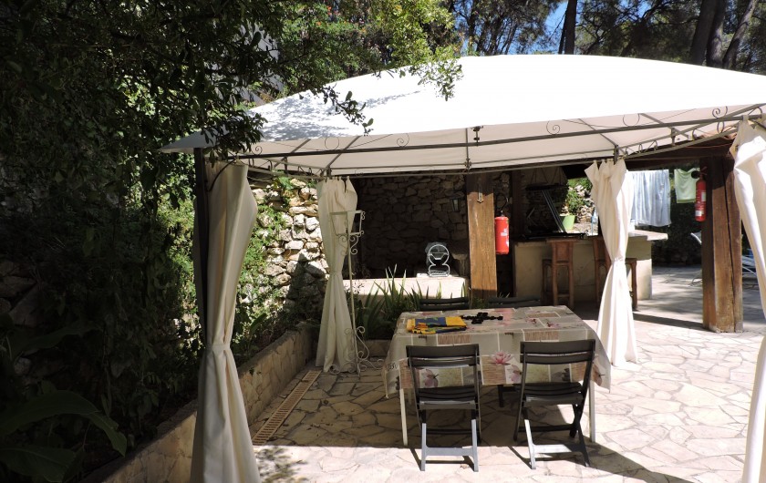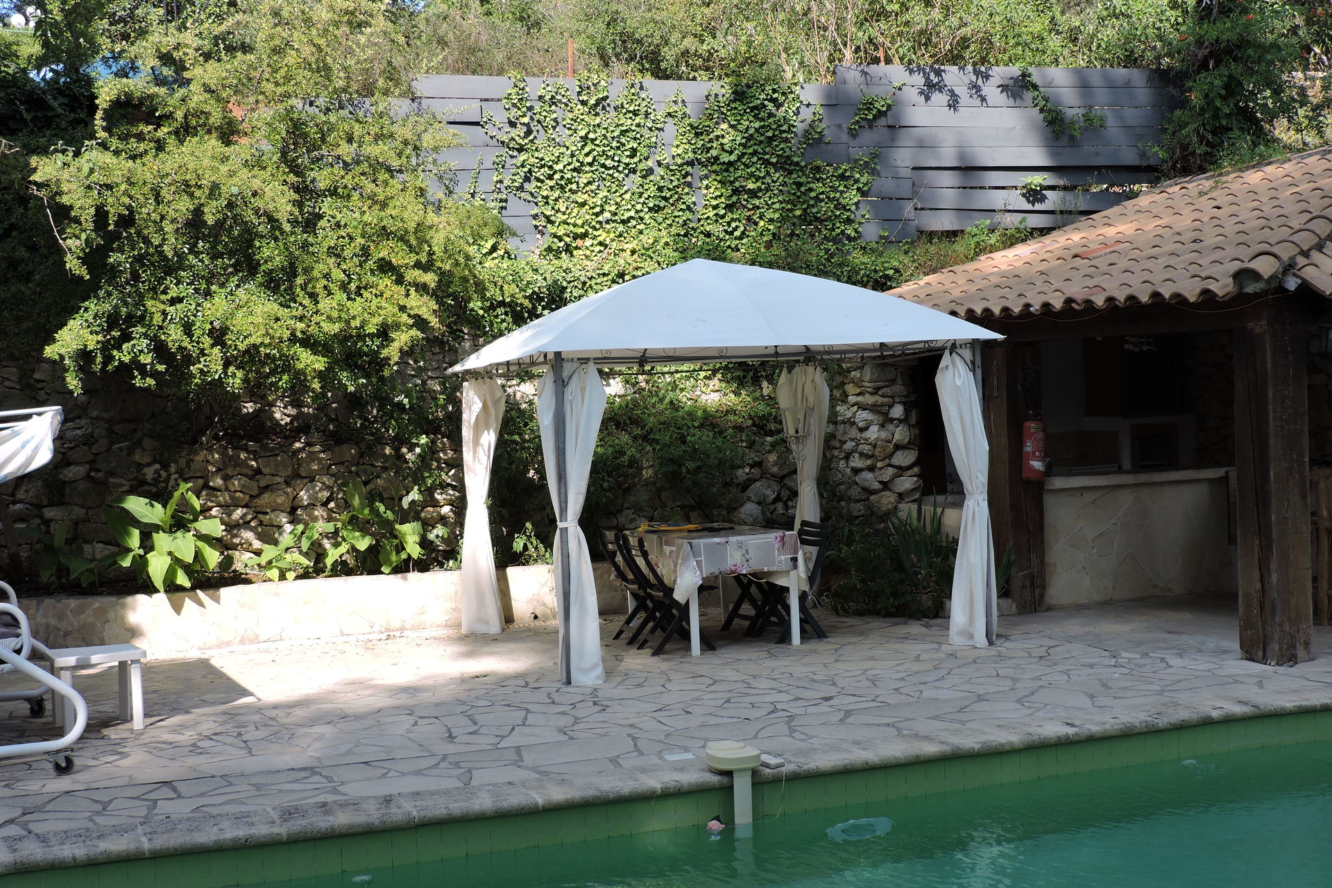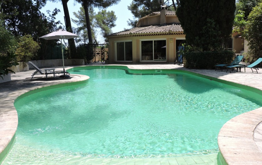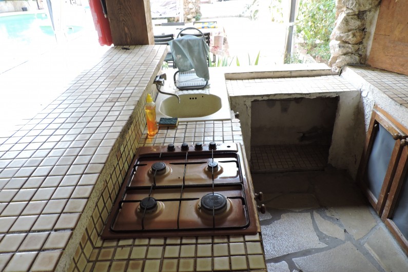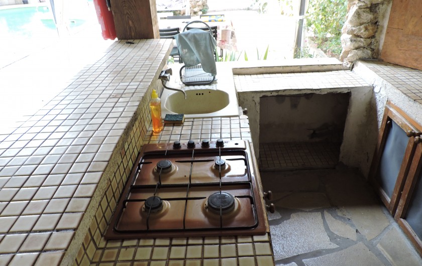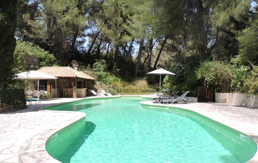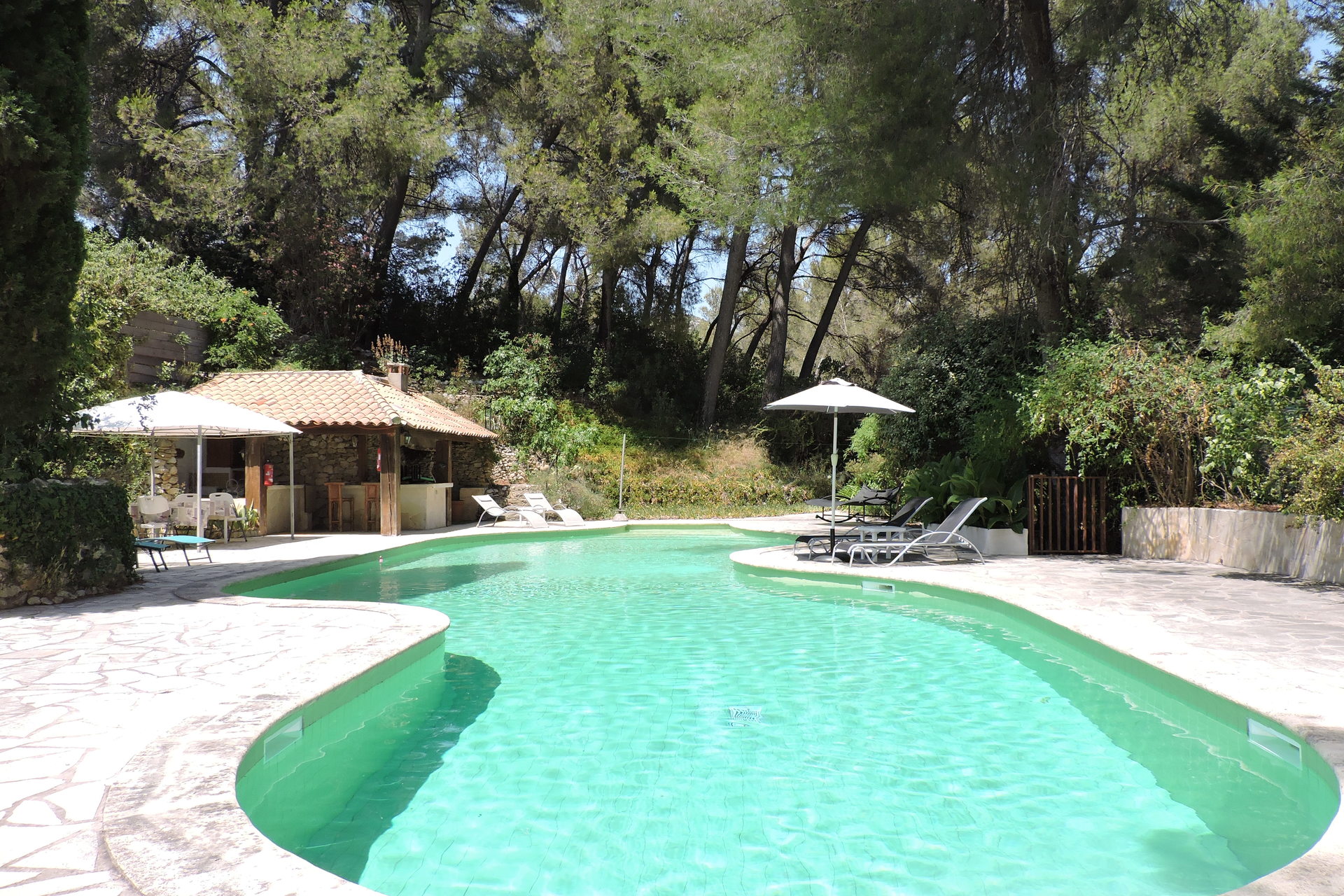 Pool-house la cuisine d'été ouverte . Incitation au farniente, une quiétude au pied du massif du Garlaban.La propriété est clôturé.Un lieu très calme.avec les chants des cigales ( parking voiture piscinste )Portail automatisé avec télécommande.Maison est climatisée.POUR LA LOCATION ,NOUS PRENONS PAS DE PERSONNES QUI HABITENT DANS LA RÉGION PACA.