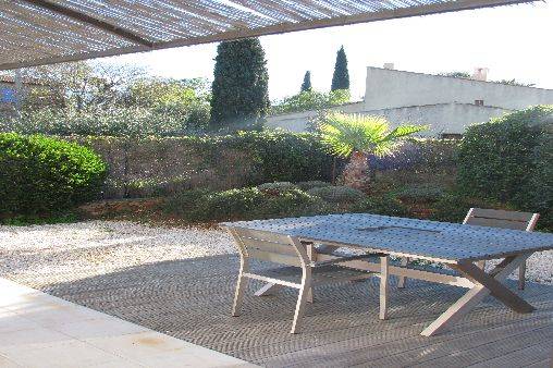 Location d'une agréable villa neuve de 90 m2 à Bandol dans le Var en Provence, style contemporain, avec un jardin ensoleillé de 120 m2, et un garage indépendant. Elle se situe dans le quartier calme et recherché de l'Escourche, à 5 min à pied des plages.Terrasse et jardin au calme avec salon de jardin et transat, elle sera idéale pour vos vacances en famille.