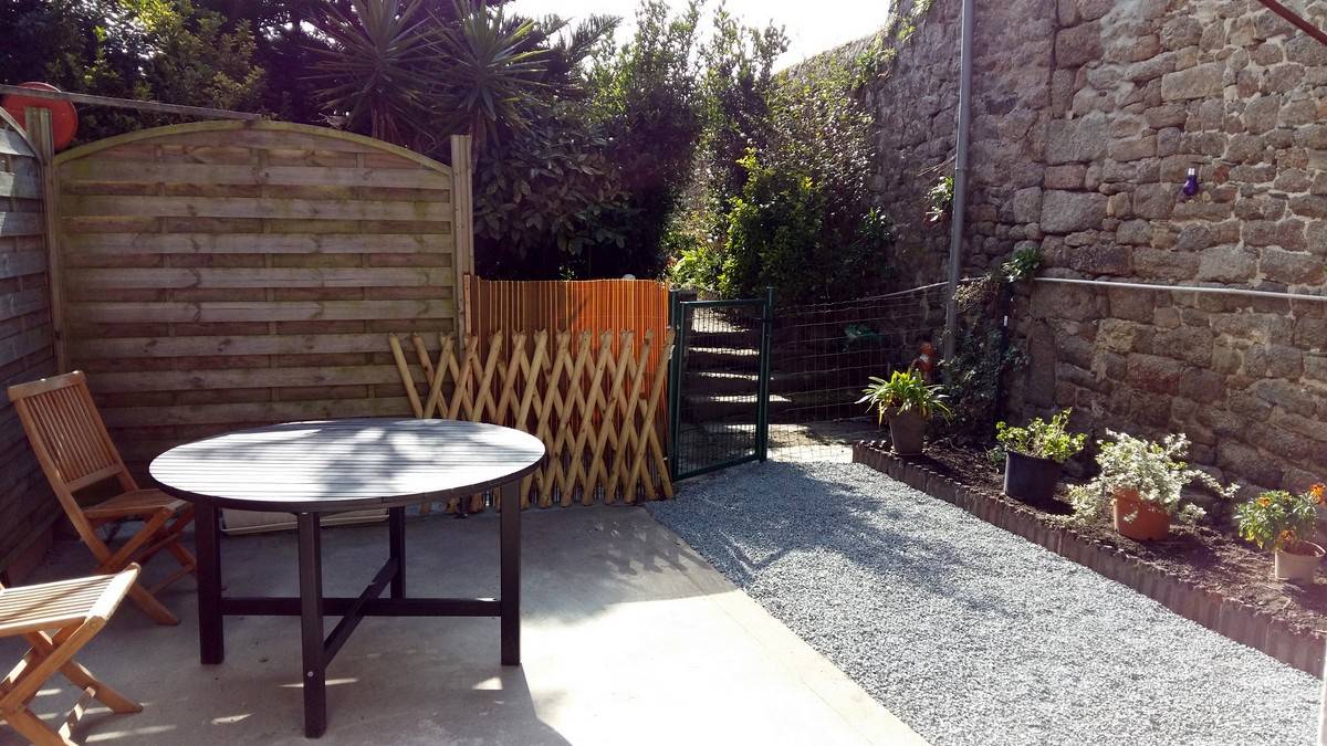 Terrasse abritée et bien exposée, avec salon de jardin, barbecue et transats. Un local est à votre disposition pour le rangement de vélos, poussettes,...