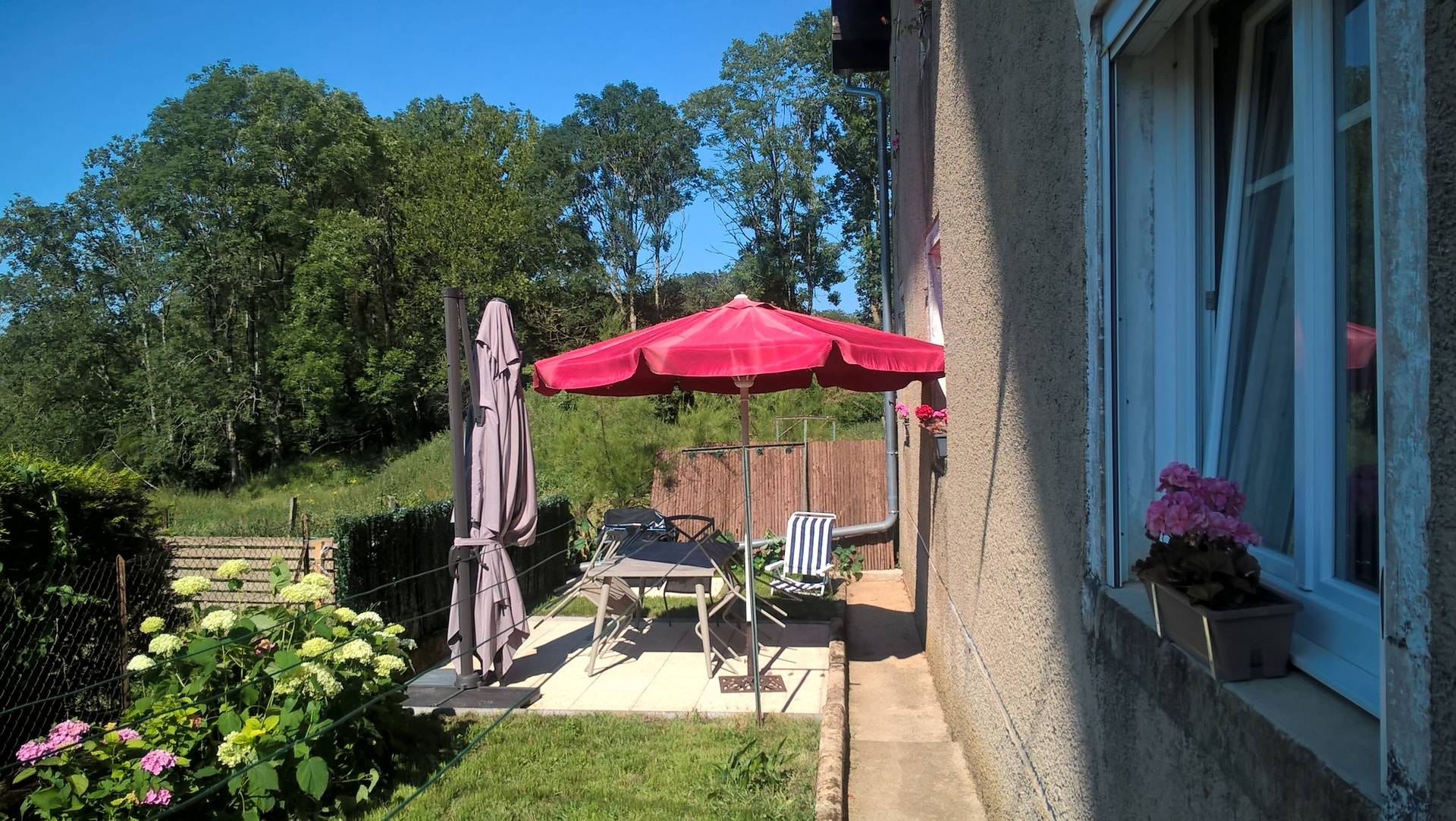 A l'extérieur salon de jardin ,parasol et barbecue dans cour close