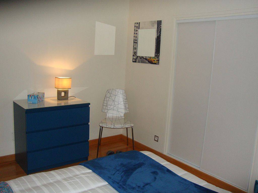 Une chambre, éclairée par un discret puits de lumière, possède un lit double, un placard/penderie et une commode
