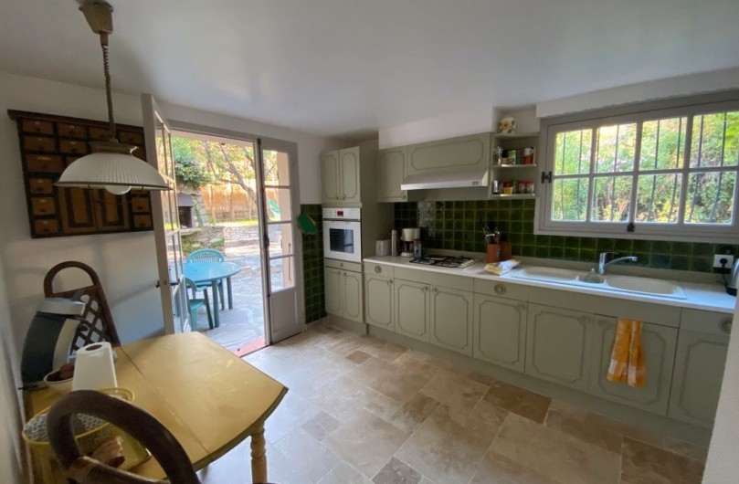 cuisine toute équipée (four, 3 plaques gaz + 1 électrique, mixeur, balance, machine à café dosettes ou filtre, réfrigérateur, etc)