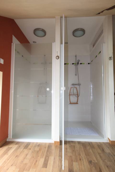 1er étage : 2 chambres indépendantes de 30m² avec lit double (penderies et armoires) – 1 chambre indépendante avec 2 lits simple – Salle de bain de 20 m² (2 vasques, 2 douches, machine à laver, grands placards de rangement) – 2 toilettes (équipements bébé : 2 lits bébé, table et matelas à langer, baignoire bébé, 2 chaises hautes)