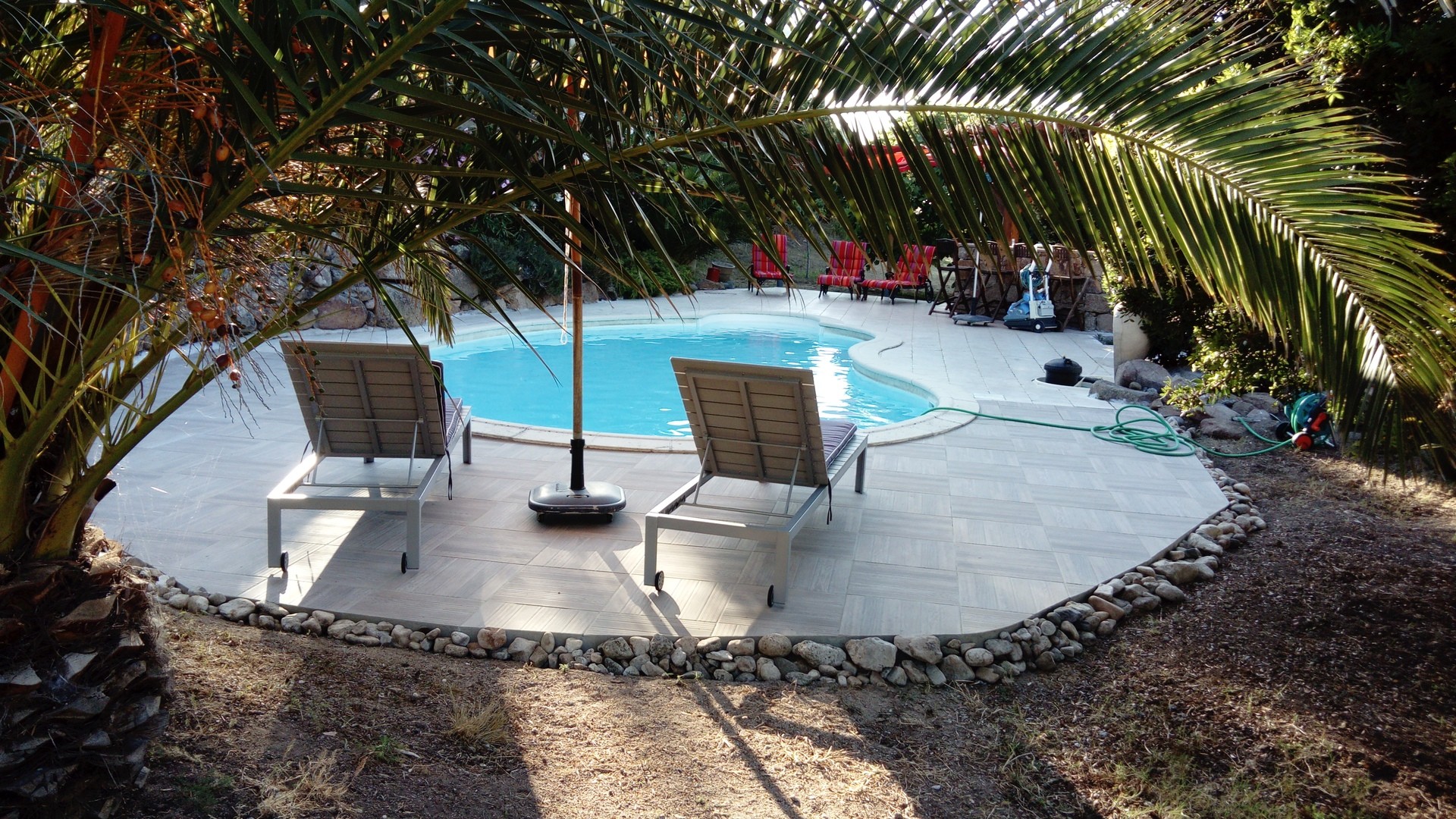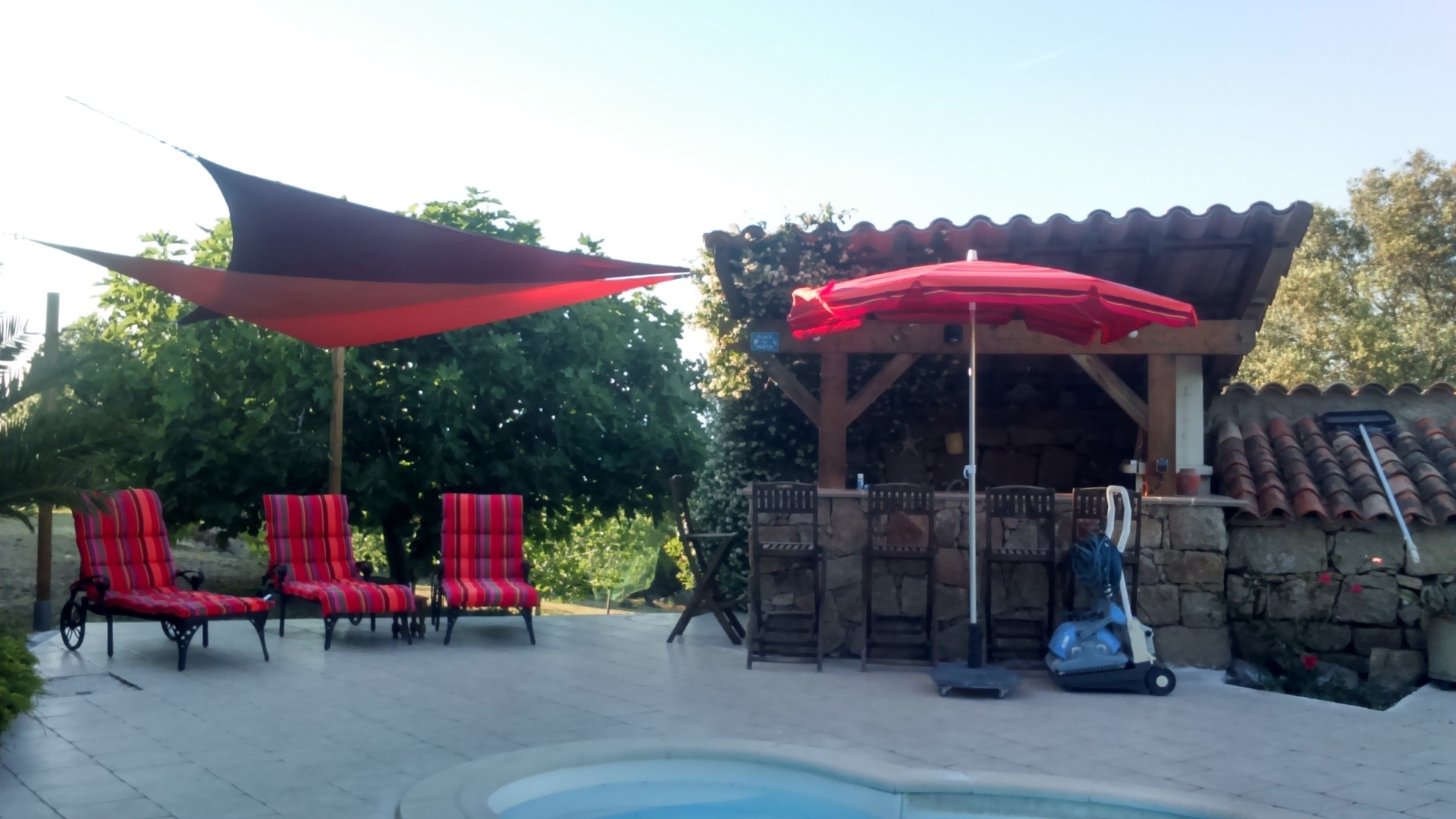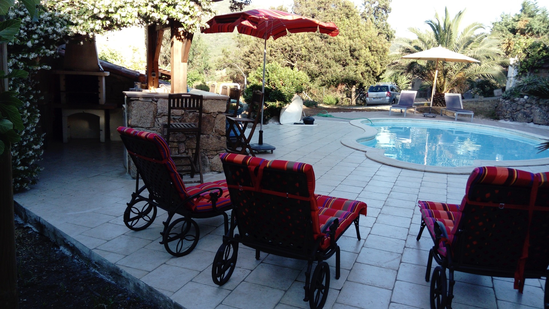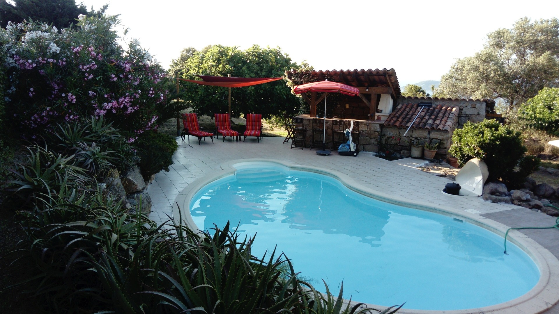 A côté de la maison, une piscine de 8mX4m en forme de haricot avec son bar en pierre aménagé (barbecue en dur, évier, meuble de rangement, petit frigo). Autour de la piscine 6 transats et parasols.