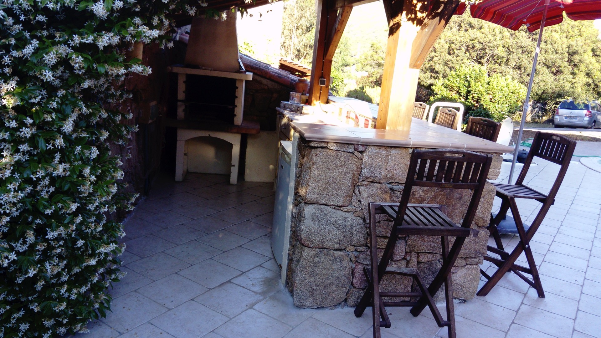 Location d’une maison traditionnelle en pierre avec piscine à Acqua d’Oria sur la rive sud du golfe d’Ajaccio (Corse du Sud). La maison sur deux niveaux et la piscine se trouvent sur un terrain de 3000 m2 arboré et clôturé. Elle dispose :