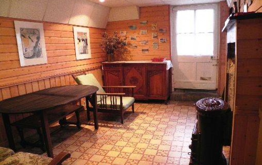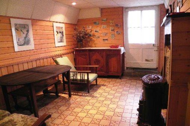 Rez-de-jardin : grande pièce à vivre avec jeux de sociétés, poêle à bois. Rez-de-chaussée : cuisine, lave-vaisselle, four, micro-onde, plaque à induction, ouverte sur le salon, TV écran plat, lecteur DVD, Hi-Fi ; une chambre avec 2 lits d'une personne, WC. A