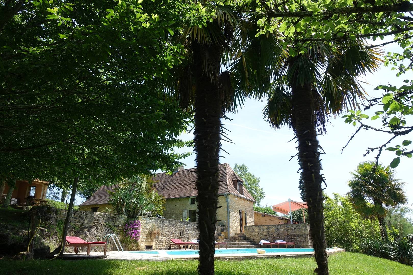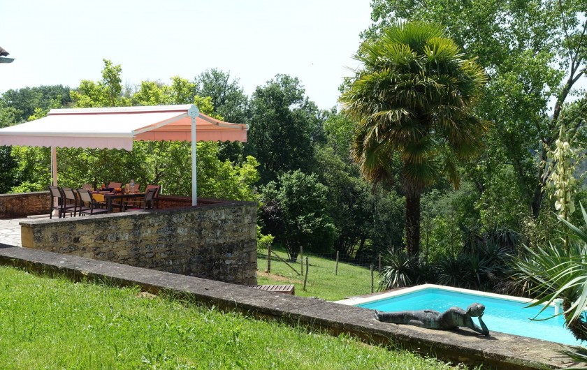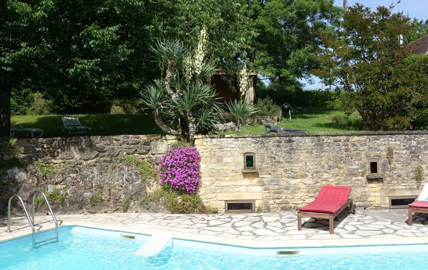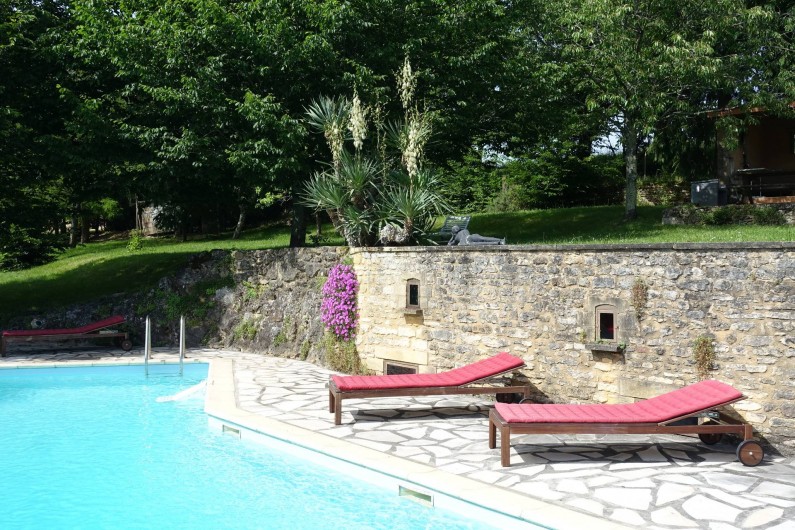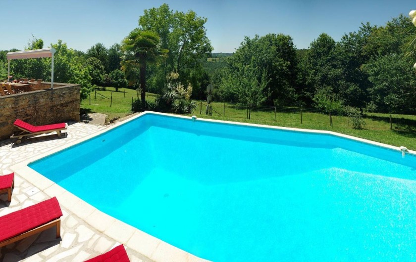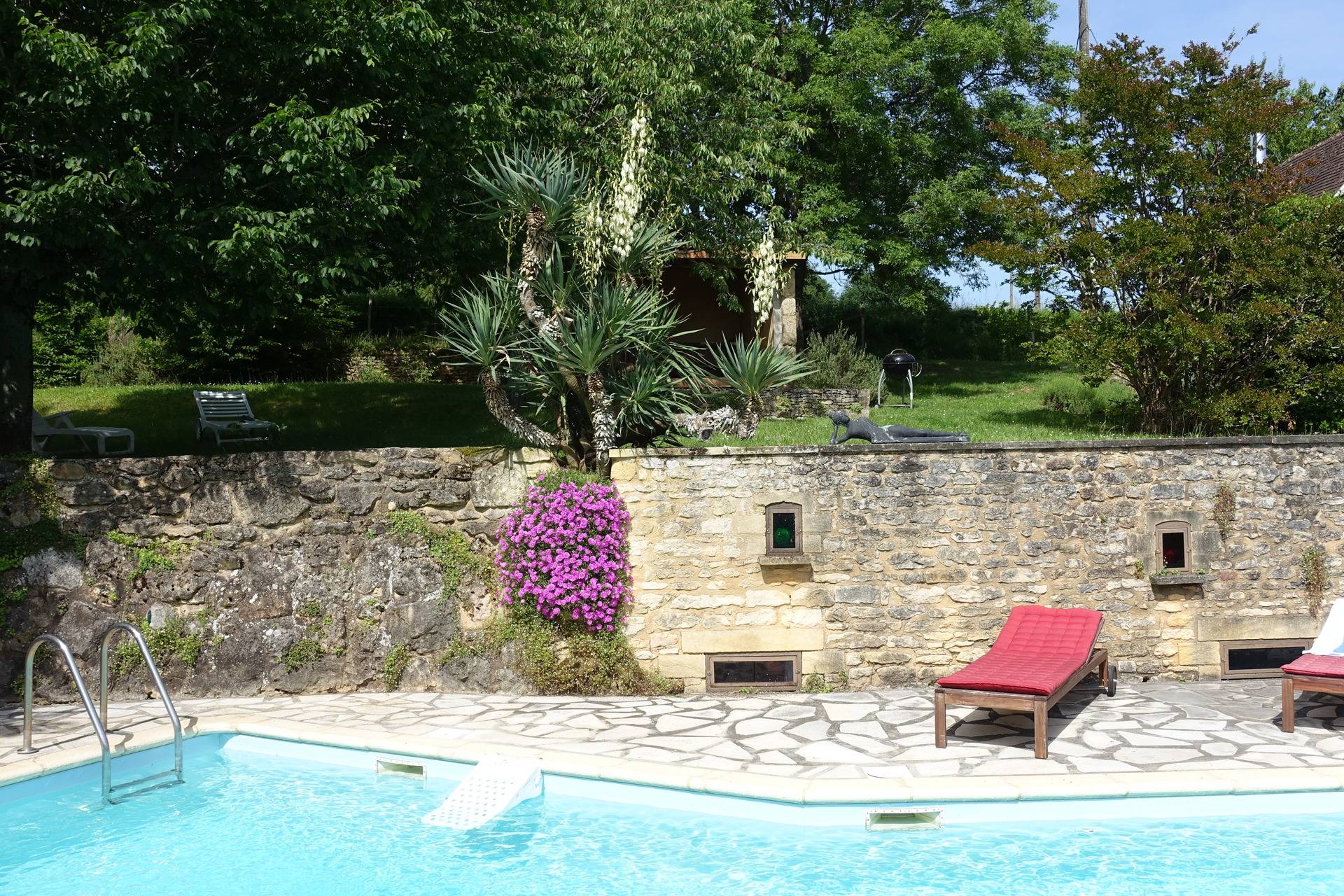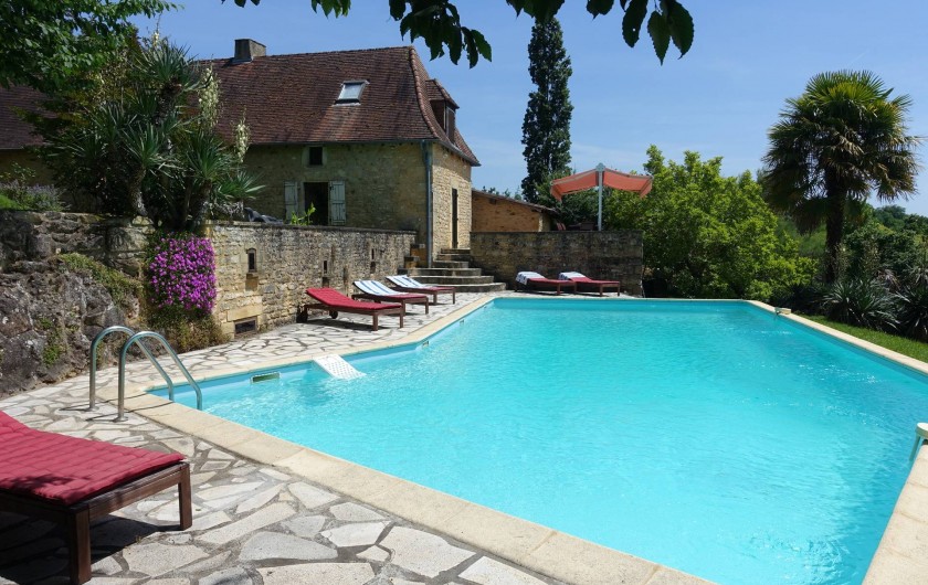 Ancrée sur une colline, la maison « Laudinie » est d'une beauté féérique. La vue, par-delà les collines vertes et les vallées, est merveilleuse. Depuis la route secondaire, un chemin de terre, sur 100 m environ, mène à l'ancienne ferme. Isolée, celle-ci comporte de grandes terres privées et un grand jardin. Celui en quête de repos le trouvera ici. Il n'y a pas de voisins à proximité et l'on est protégé des regards indiscrets aux alentours. Ici, vous passerez des vacances en toute intimité et vous reposerez. L'emplacement spacieux autour de la piscine (6 m x 13 m, jusqu'à 3 m … de profondeur) invite à prendre des bains de soleil dans le calme et les grands arbres prodiguent l'ombre nécessaire. L'aire « Barbecue-Salon » couverte permet de faire des grillades, même lorsque les conditions atmosphériques sont incertaines. Depuis la cour intérieure et en passant par le salon, on accède à la grande terrasse de rêve où l'on savoure des couchers de soleil magiques. Et pourtant, la maison occupe un emplacement merveilleusement central, au coeur d'innombrables curiosités et d'activités de plein air du Périgord Noir, renommé pour ses châteaux, ses petites villes moyenâgeuses (Sarlat 25 min) et les cavernes préhistoriques (Les Eyzies 10 min). Point phrare, piscine 3 étoiles. Lire moins Lire la suite