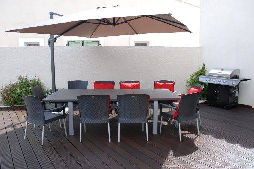 Maison mitoyenne de 2008 de style contemporain dans lotissement calme et prisé de Gruissan. Vous serez à 5 minutes à pied de la plage de mateille. Piscine et terrasse bois Ipe, salon de jardin et transat très tendance pour prendre l'apéritif. Maison entièrement climatisée (3 chambres sur 5), accès internet dans toutes pièces. Maison proche d'une grande surface (5 minutes à pied), boulangerie et journal (10 minutes).