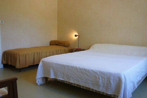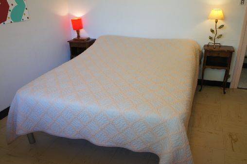 et peut accueillir sans problème trois couples ou deux couples et quatre enfants. Un petit lit d'enfant et un lit parapluie sont aussi à disposition. Il y a une salle de bain et un WC à part. La cuisine séparée est totalement équipée. Le séjour comporte une grande table avec des bancs (qui peut accueillir dix convives) et un salon autour de la cheminée.