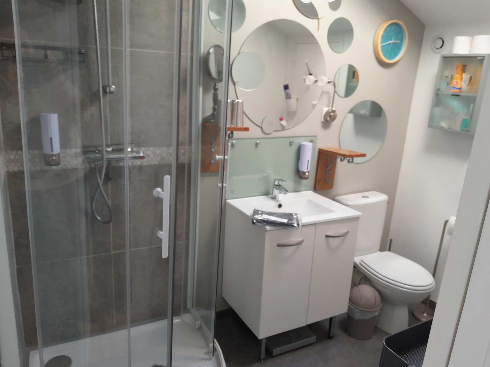 Une chambre pour 2 personnes , une salle de douche avec lavabo et wc ainsi , un coin lave linge.