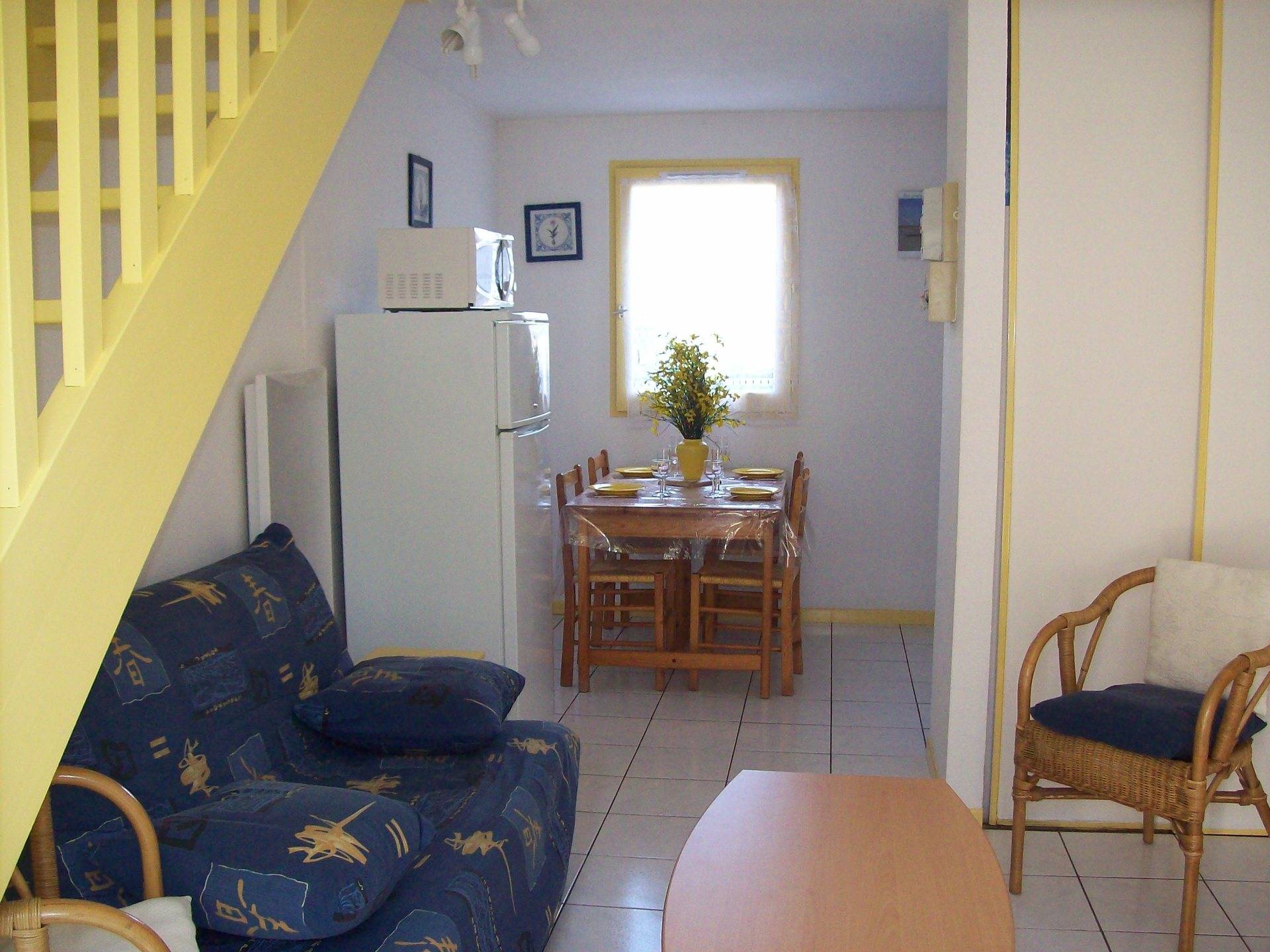 Séjour : 1 ClicClac deux places, télévision ,lecteurDVD,table basse,meuble,fauteuils rotin