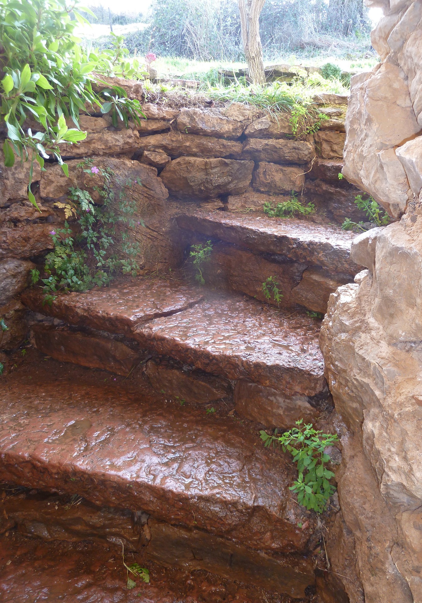 Au niveau principal, devant la façade, une terrasse avec des grandes dalles en marbre rouge du pays,