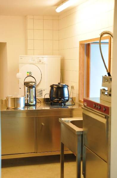 Réfectoire : 5 tables de 10-11 pers, tables pour buffet, armoire à vaisselle