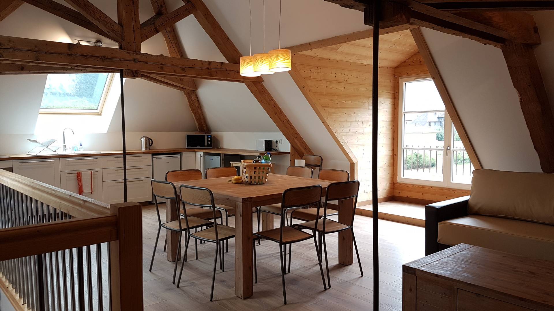 jusqu'à 6 personnes. Il comprend une chambre avec deux lits ou un lit double (2 x 90 x 190 cm ou 160 x 190 cm) et une grande mezzanine (21 m2) divisée en deux avec deux lits simples de chaque côté (90 x 200 cm).