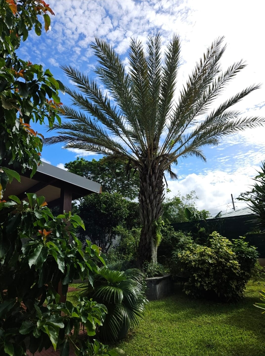 jardin et sur les arbres exotiques : manguier, papayer, bois blanc, avocatier, palmiers multipliant et bien sûr le dattier !