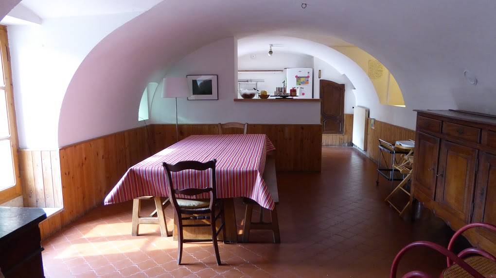 Salle à manger voutée (ancienne étable); table en chêne pouvant accueillir une dizaine de personnes. Bancs et chaises. Buffets de vaisselle. Ouverture vers la cuisine (équipée de lave-vaisselle, cuisinière électrique, chauffe-eau, frigidaire, double évier, grand plan de travail, machines diverses).