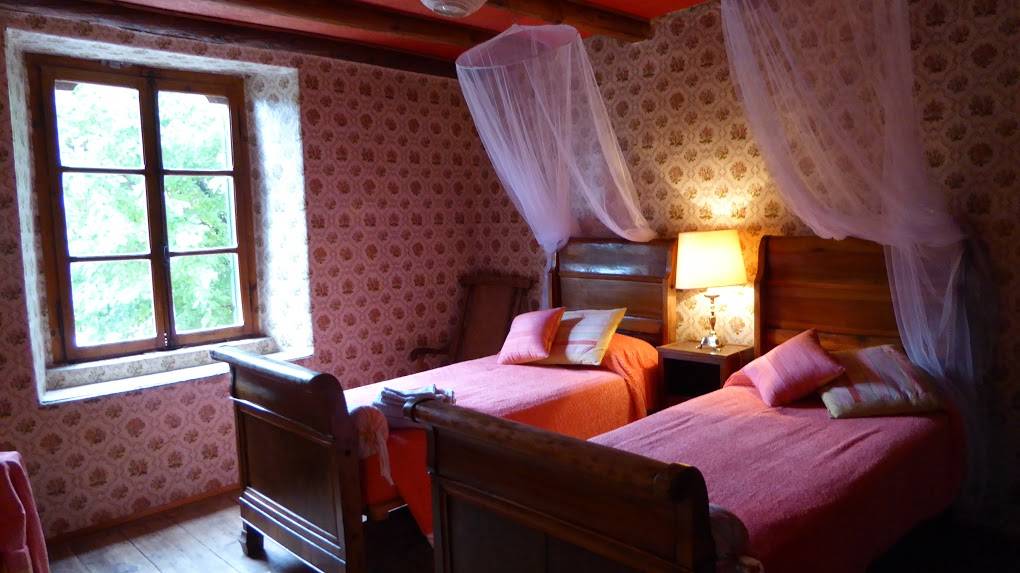 La chambre rouge (sud), deux lits anciens séparés, grande armoire, commode. Chambre d’adultes.