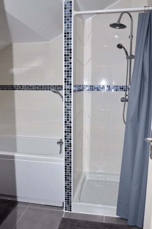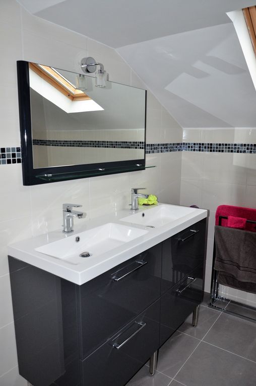 Salle de bain : meuble à deux vasques, douche et baignoire, sèche-serviettes,