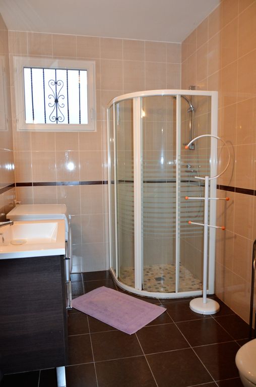 - 1 salle de bain avec meuble une vasque, douche à l'italienne, sèche-serviettes, lave linge et wc.