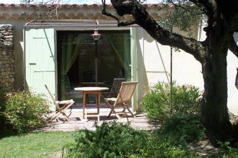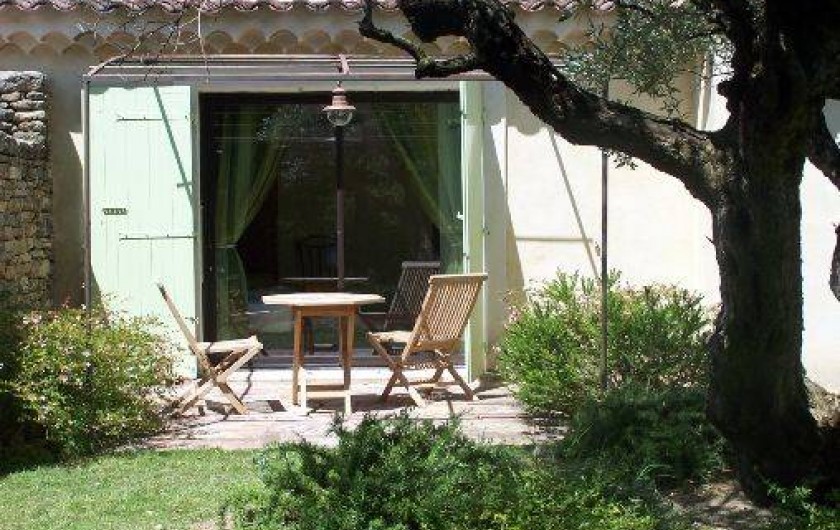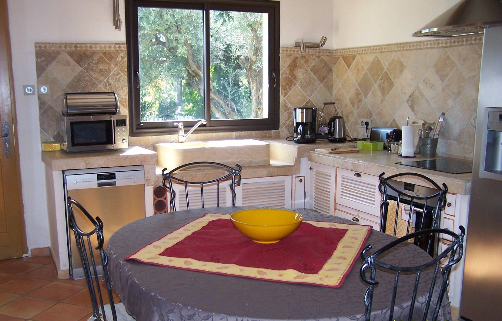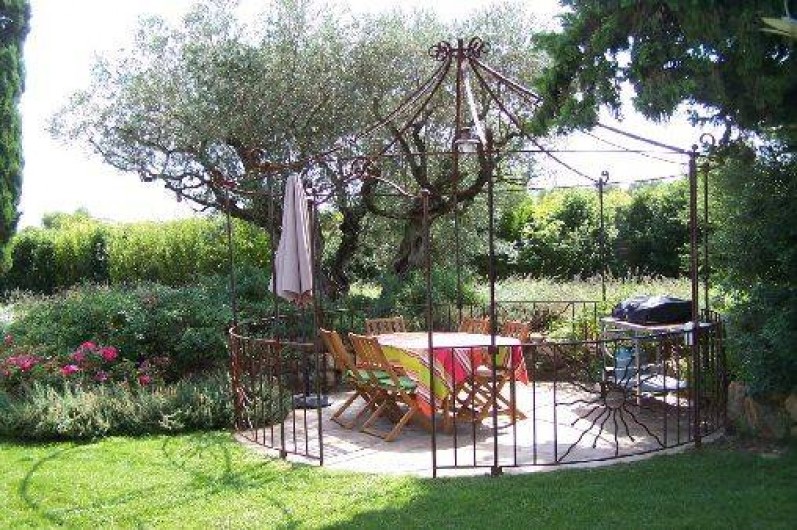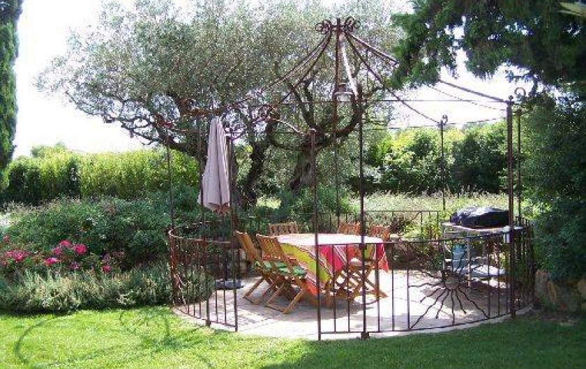 Une jolie gloriette en fer forgé lovée sous un olivier, vous attendra pour les repas que vous pourrez préparer à la plancha.