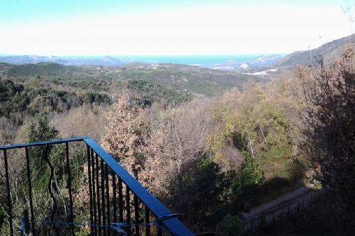 Terrasse 25 m2 salon en teck pour repas et apero avec vue imprenable sur saint florent cadre bucolique dans la montagne corse.