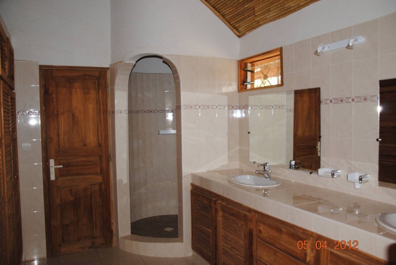 terrain, un garage, plus un emplacement parking, puis la maison, et ensuite, de l'autre côté , une grande terrasse avec coin repas, salon, bar, plancha et barbecue qui donne accès à la piscine entourée de transats. Un espace extérieur pour la douche. Elle est entourée d'un jardin arboré (papayer...), fleuri (bougainvilliers...)et fruitier(citron et pamplemousse...).