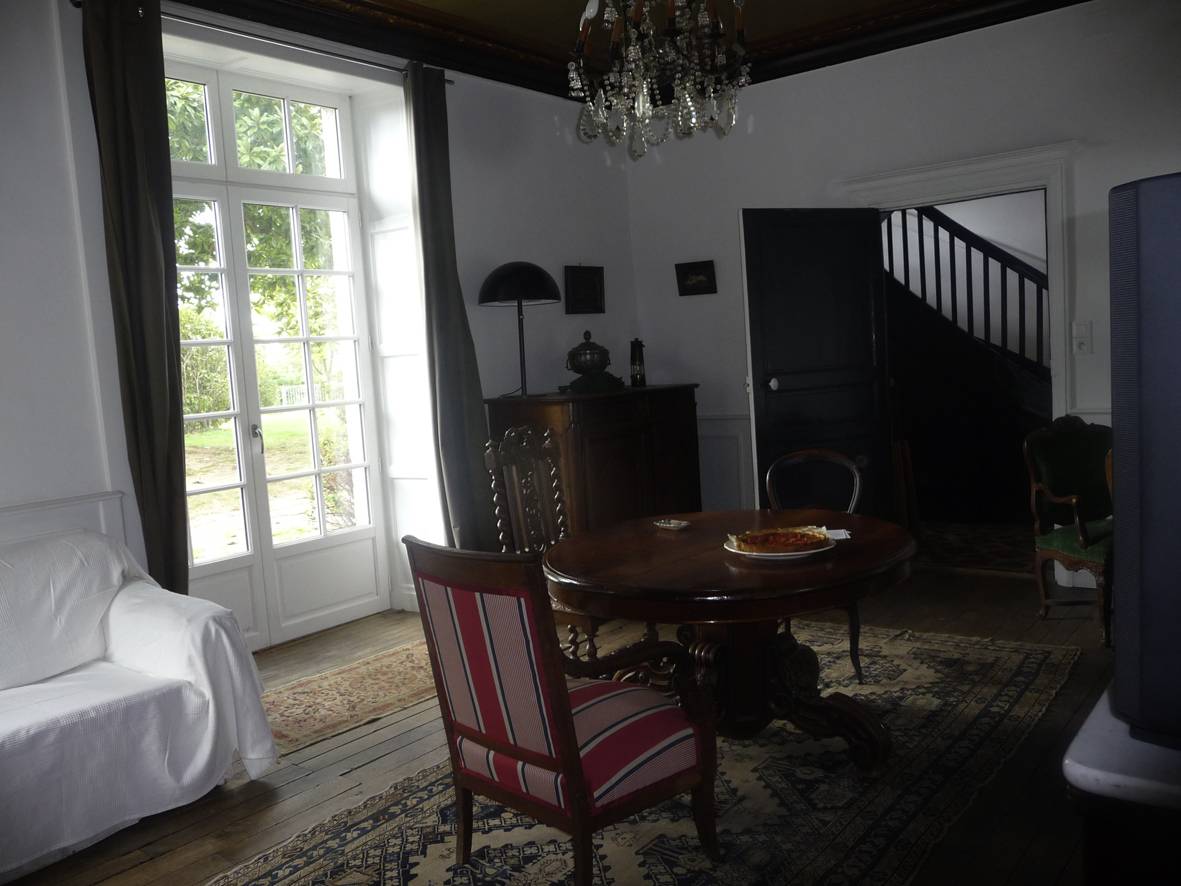 manger et vaste salon-séjour tous deux avec cheminée et ouvrant sur le jardin.