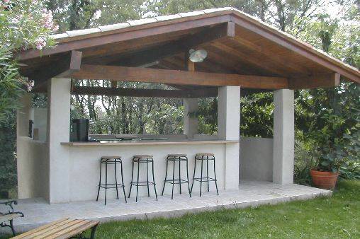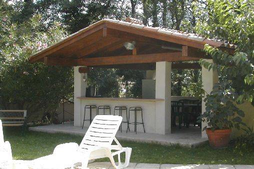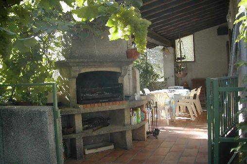 Grande terrasse dominant la piscine avec barbecue et four à pizza et 2ème terrasse (soleil levant).